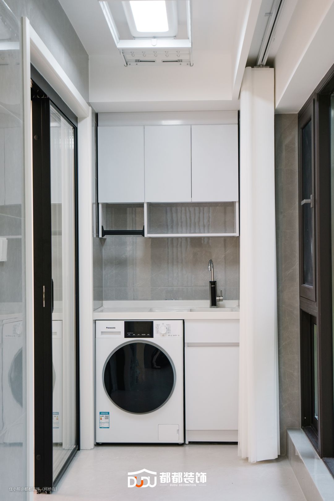 厨房遵循L型动线布居,高效便捷,大单槽、嵌入式洗碗机一应俱全,白色哑光橱柜与地砖相映衬,吊顶植入灯带,备菜无惧背光烦恼。