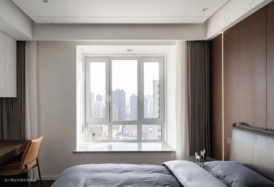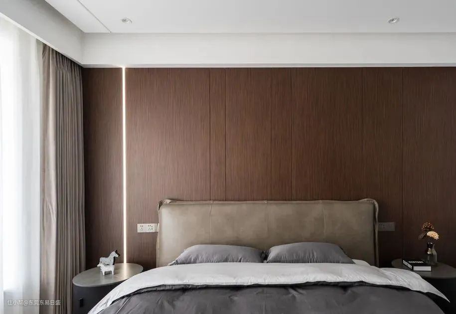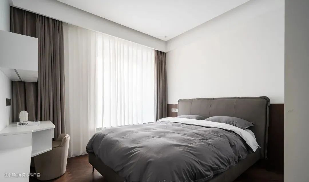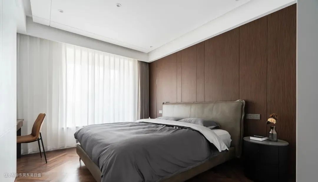 主卧享有极佳的采光和视野。原木材质的床头背景墙与人字拼的实木地板相得益彰,共同营造出温润舒适的休憩空间。高级灰床品和浅灰绿色皮质靠背简约舒适,而白色柜体为卧室提供充足的收纳空间,使其顶天立地。