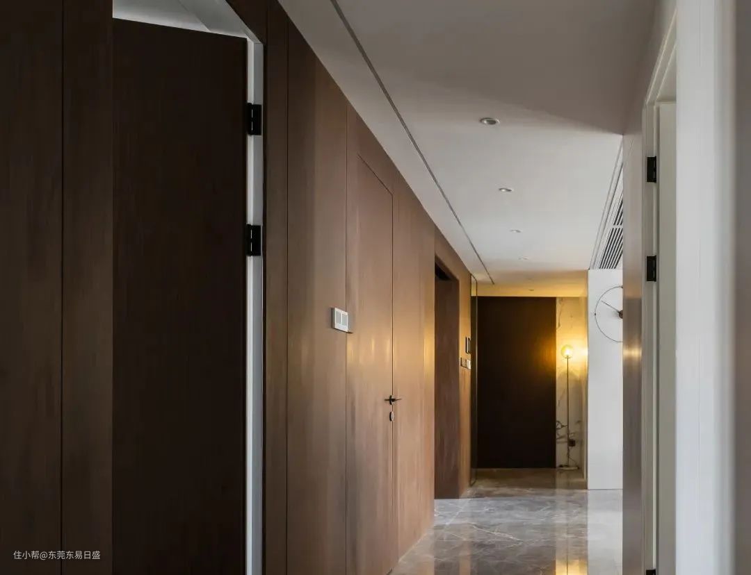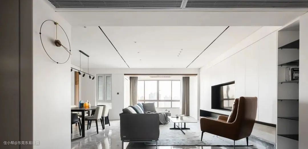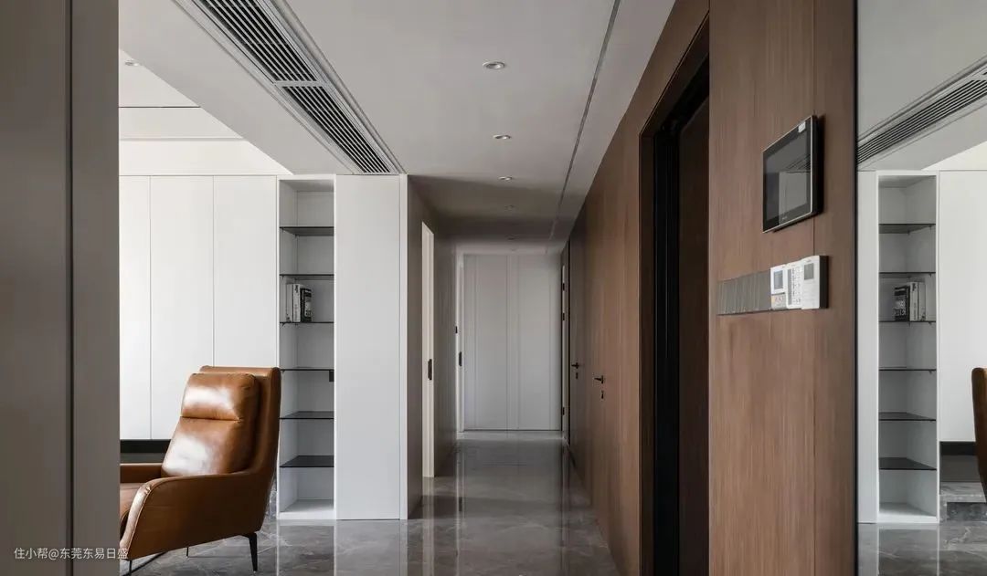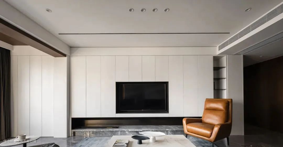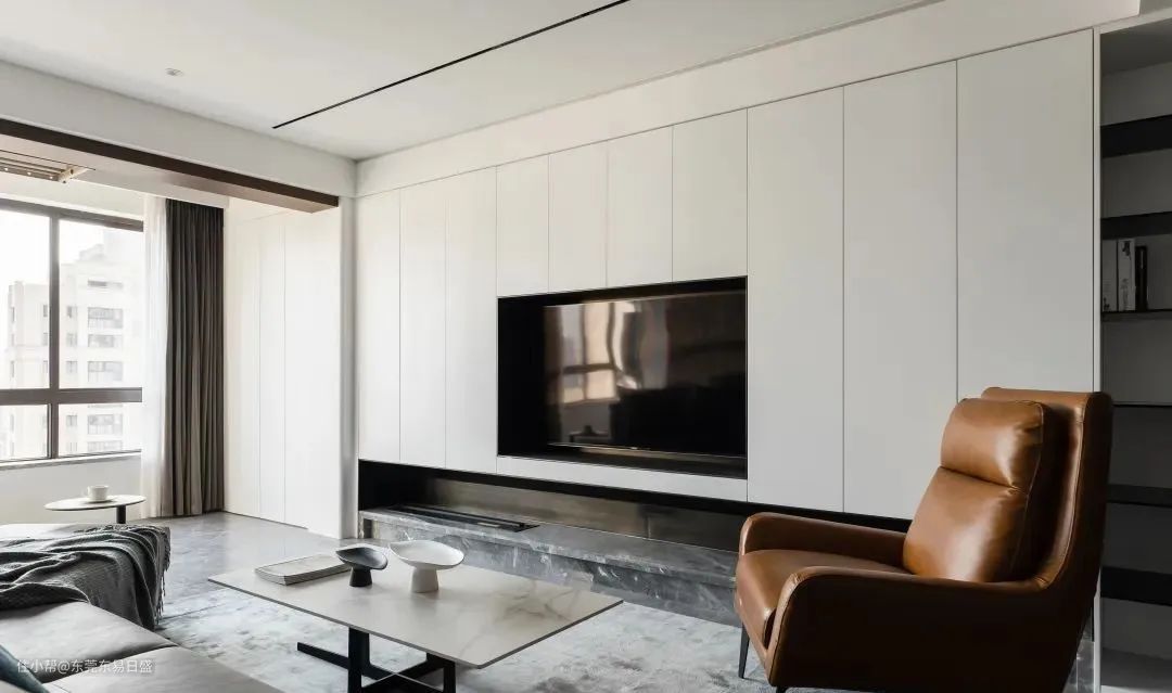 玄关过道的大面积暖色木饰面,营造出宁静祥和的氛围,细致柔和的色调将室内温润清雅的一面展现得淋漓尽致。微妙的灯光隐藏在细微之处,打造出层次感丰富的空间。 挪步进入,一把棕咖色皮质单人沙发悠闲地摆放在一角,其悠逸的造型引领着人们去一窥其中的奥秘。与普通客厅不同,这个大横厅的空间宽敞通透,采光和视野都极佳。多人位灰色沙发上,高级灰与藏蓝色靠枕错落有致,为高雅环境注入一抹趣味,带给人舒适的体验感与距离感。 嵌入式电视柜与悬空设计相结合,既不占用额外空间,又营造出简约轻盈的视觉美感。客厅阳台与电视背景墙相连,巧妙地弱化了两侧门洞,提升了空间的统一性和完整性,同时还增强了收纳能力,实属一举多得。