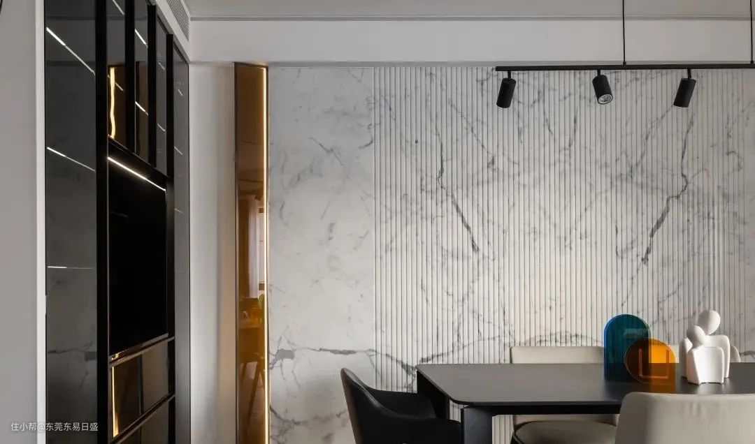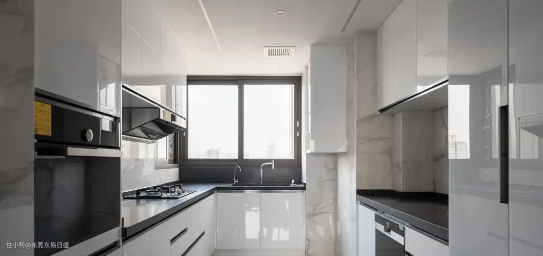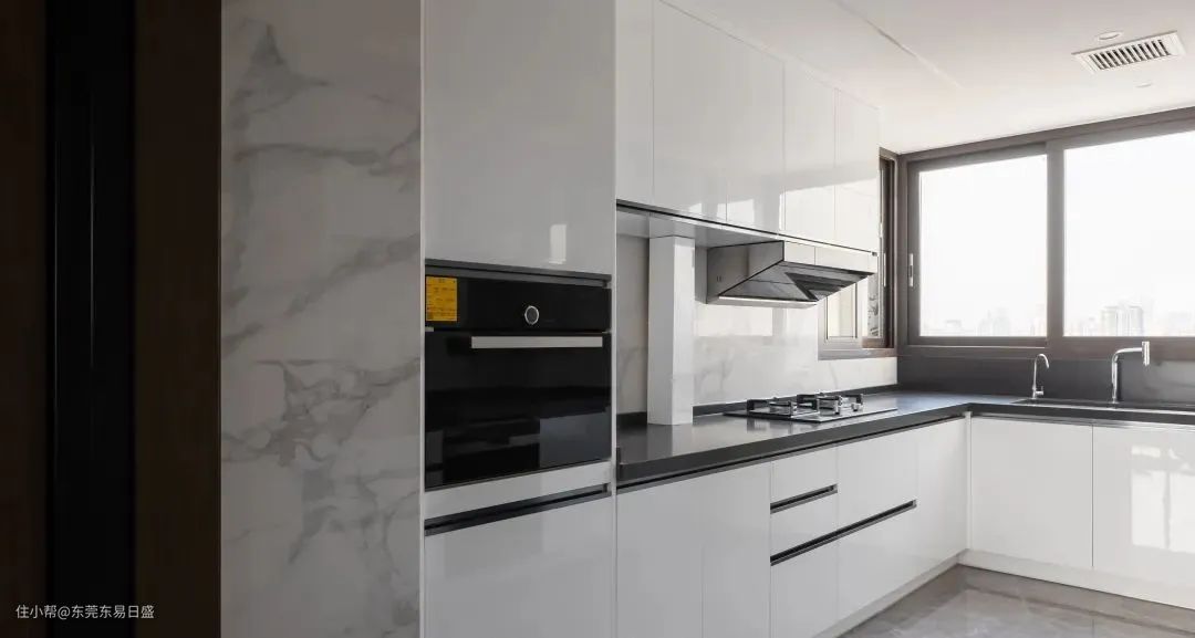 厨房U形操作台布局流畅自然,配色上黑色大理石台面与白色岩板橱柜相得益彰,既中和了厨房的油腻感,又带来简约洁净的视觉感受,使烹饪成为一种享受。