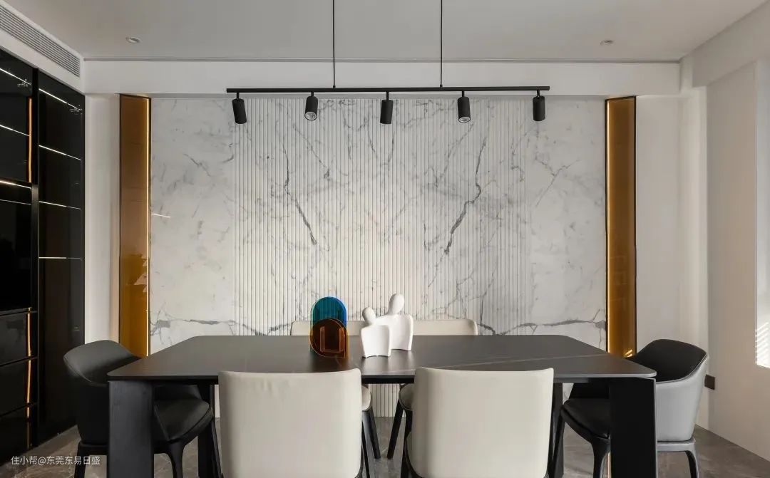 餐厅背景墙大面积留白,为空间注入了无限的想象力。纯黑色和浅灰色的餐具不仅耐脏而且耐看,搭配黑色大理石餐桌面和光线的点缀,无形中凸显出雅致舒适的就餐空间。