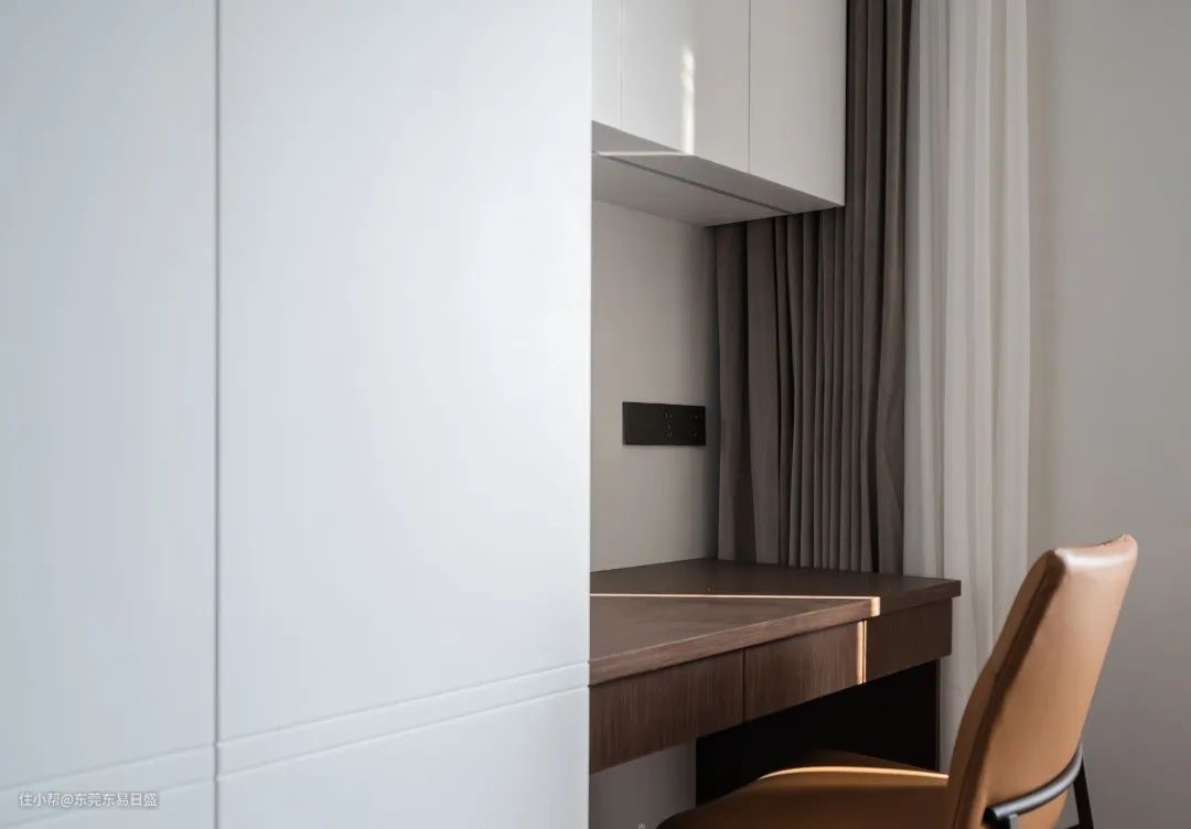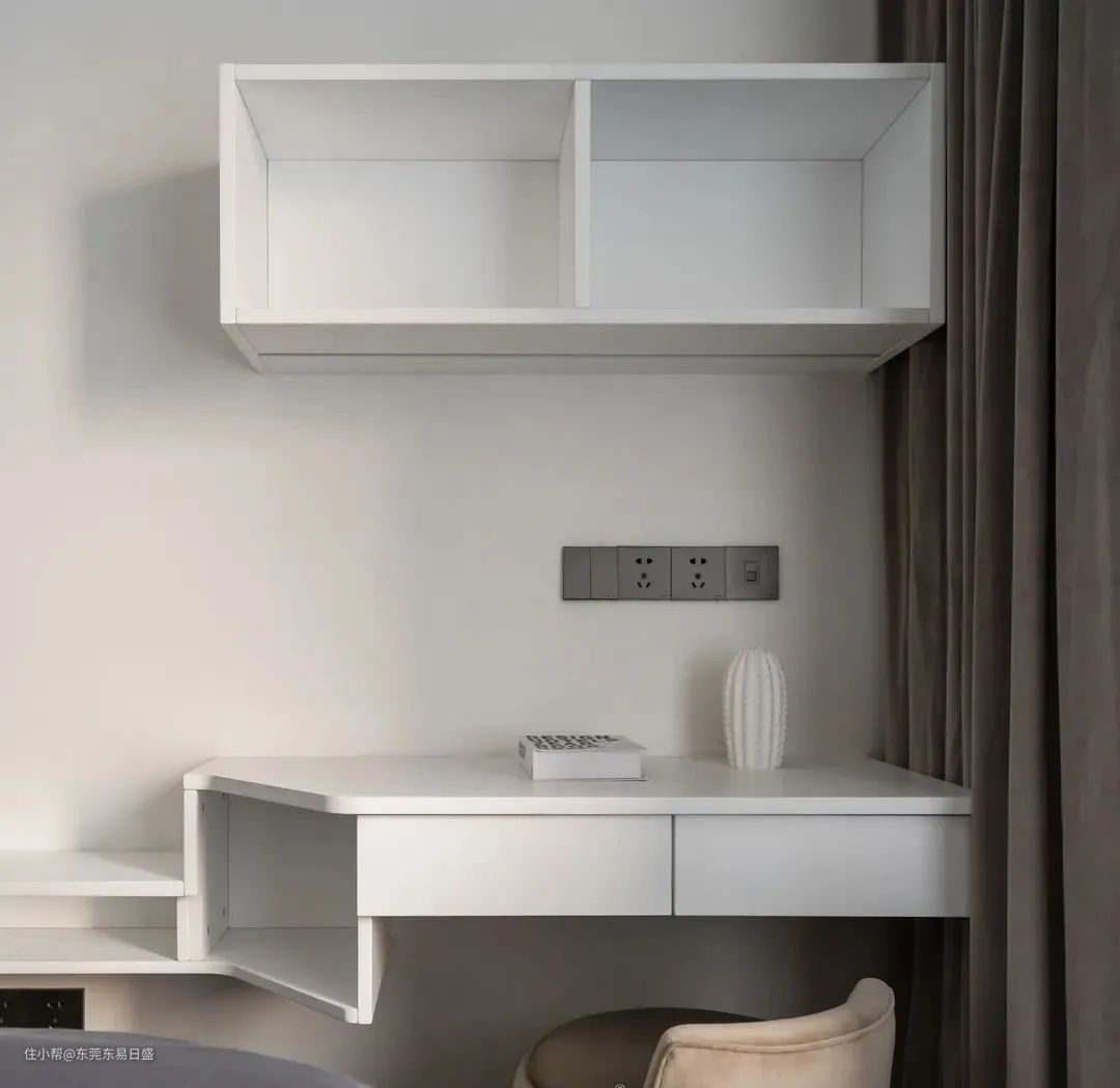 次卧是儿童房,装修布局虽与主卧相似,但从卧的配色、弹性十足的床垫、绵软蓬松的床品,到量身定制的书桌、圆润亲肤的坐凳,无不体现了对孩子的贴心呵护。 卧室墙面大面积采用白色,既彰显了纯洁无瑕的心灵,也为未来房间留下了变化的空间。