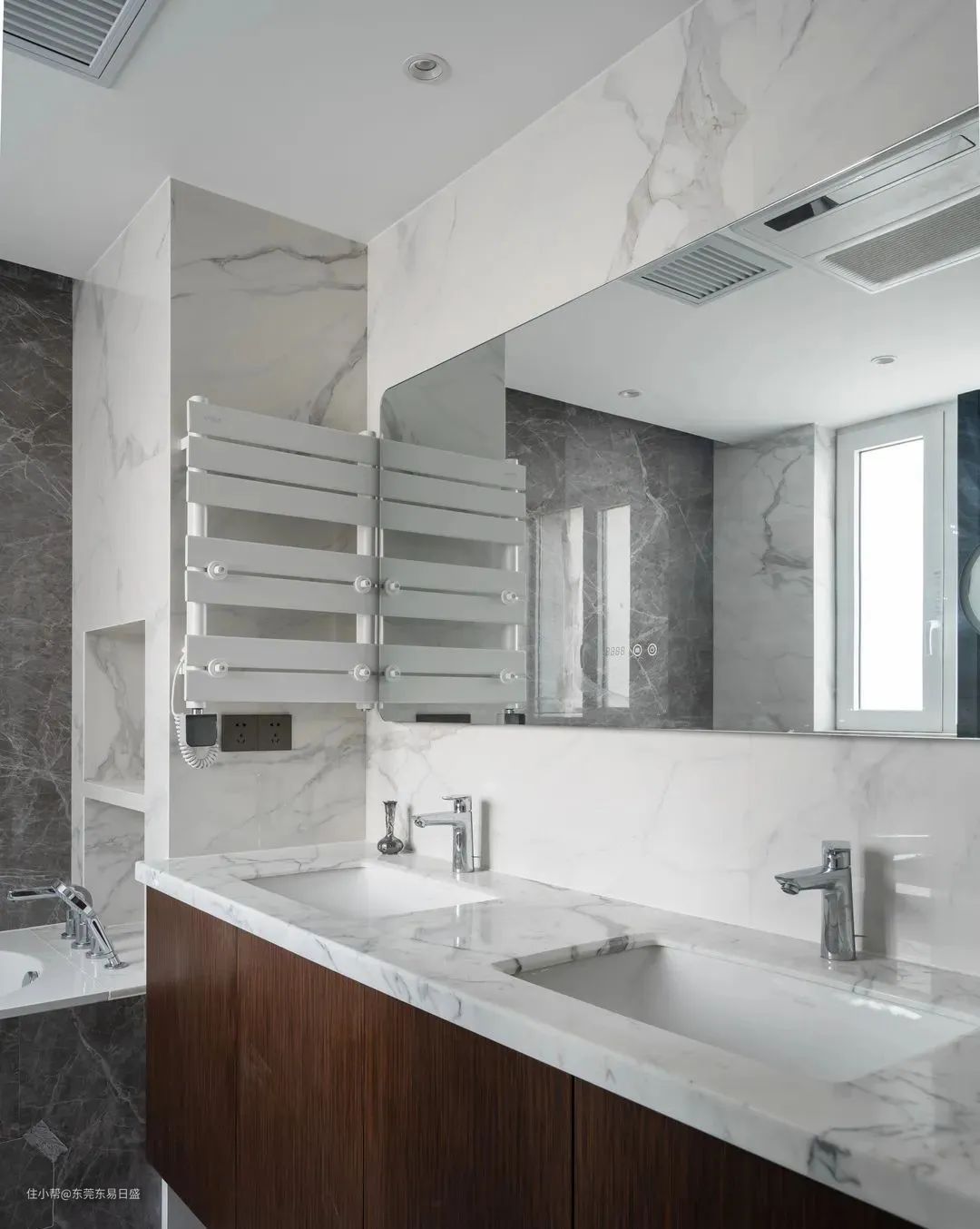 洗手间采用常规的干湿分离设计,大理石的质感搭配原木色温润,创造出一种高级又具有质感的空间。