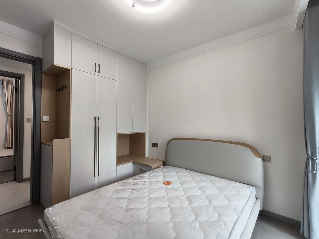 主卧是一个长方形户型,一侧作为休息区,米白色软包床头搭配,软乎乎的,非常温馨,原本的卧室是没有衣帽间的,但是那个女孩子不想拥有一个带衣帽间的卧室呢所以利用一侧狭长区域,做了一个开放性衣帽间,靠墙一排组合的衣柜,同床头柜连接,形成一个整体,让空间温柔而干净。飘窗一侧做储物格设计,增加了储物空间,如果家里想把飘窗进行设计的,可以参考这种户型奥~