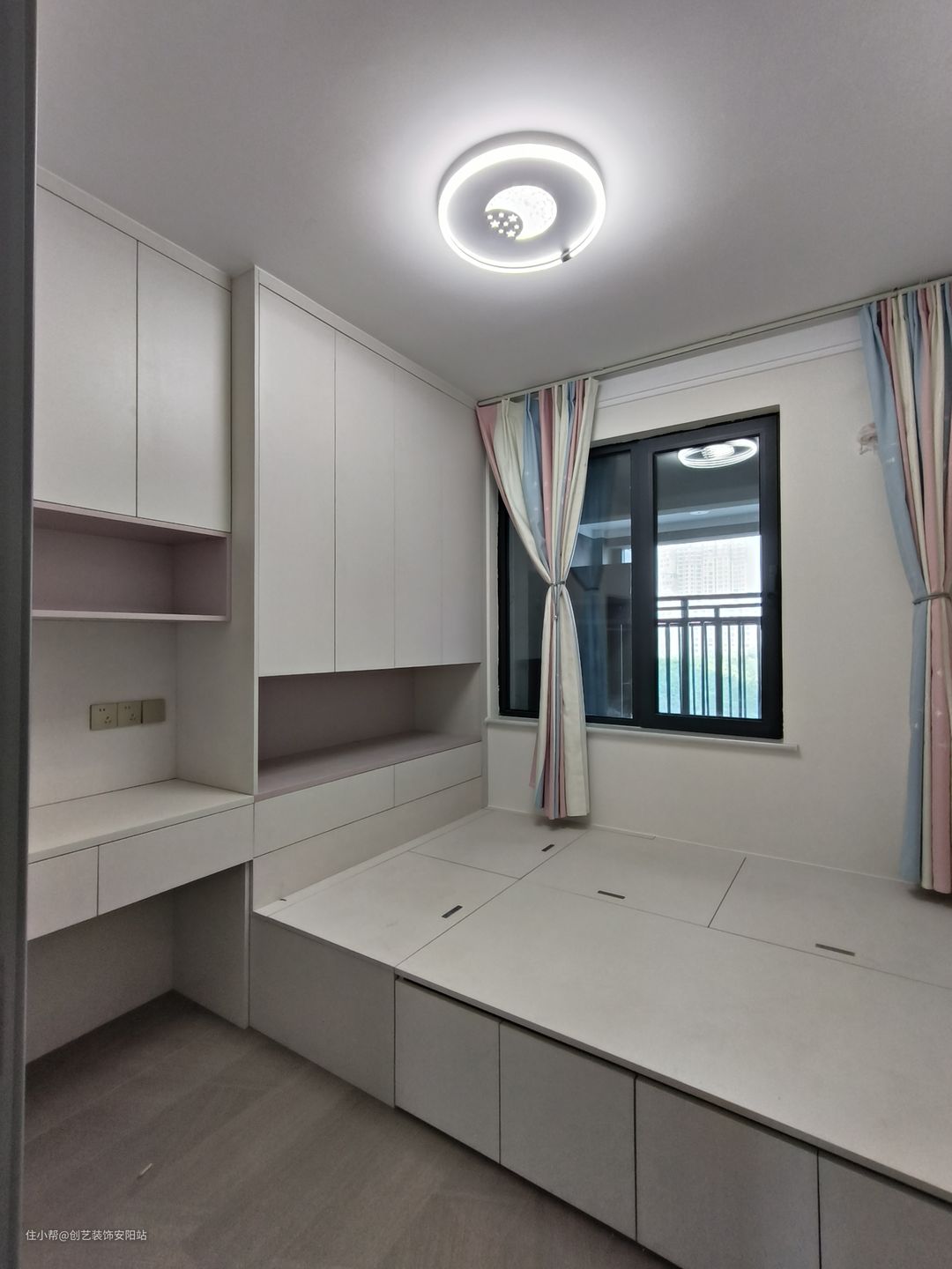两间次卧,一间作为儿童房,一间作为父母房间,父母房间没有进行复杂设计,柜子颜色跟整个房子的柜子颜色一致,简洁干净,进门左手边还进行了一个镂空设计,方便挂衣服和放置小物品,床头选用了一种浅灰色,沉稳大气,在整个空间里也不显得突兀!这个房间联通阳台,用玻璃门进行隔断,采光非常棒,家里人下午时间可以在自己屋子里晒晒太阳,非常惬意 儿童房因为空间局限性选用了衣柜书桌一体设计,紫色加白色,视觉上非常的舒适还高级!床头连着书桌,学习,休息都可以在这个地方进行!书桌做了两个抽屉,用来收纳杂物,本笔就不会杂乱无章! 免拉手设计,视觉上更加清爽!