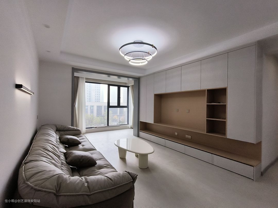 1.客厅餐厅一体设计,增加了空间感,采光和通风也更好,整体以现代为主增加原木元素,视觉上更加清新、柔和。墙体以白色为主,看起来即干净又简洁大方。电视背景墙选择了满墙电视柜设计,同时还留有几个格子作为开发布局,不会显得整个背景图太过沉闷,反而会显得有透气性,后期放上一些小物件什么的,也会非常好看,温馨! 2.客厅吊顶没有做过多的吊顶造型,进行极简的回字形吊顶,大量留白,后期使用软装搭配来提升家里的氛围 3.云朵样式的茶几,中和了灰色沙发和原木白色电视柜的过度,不会觉得两边颜色相差太大 4.业主选择灰色沙发是觉得方便好打理,深色相对耐脏一些。但是皮质的沙发躺上去舒适感是相当赞了!