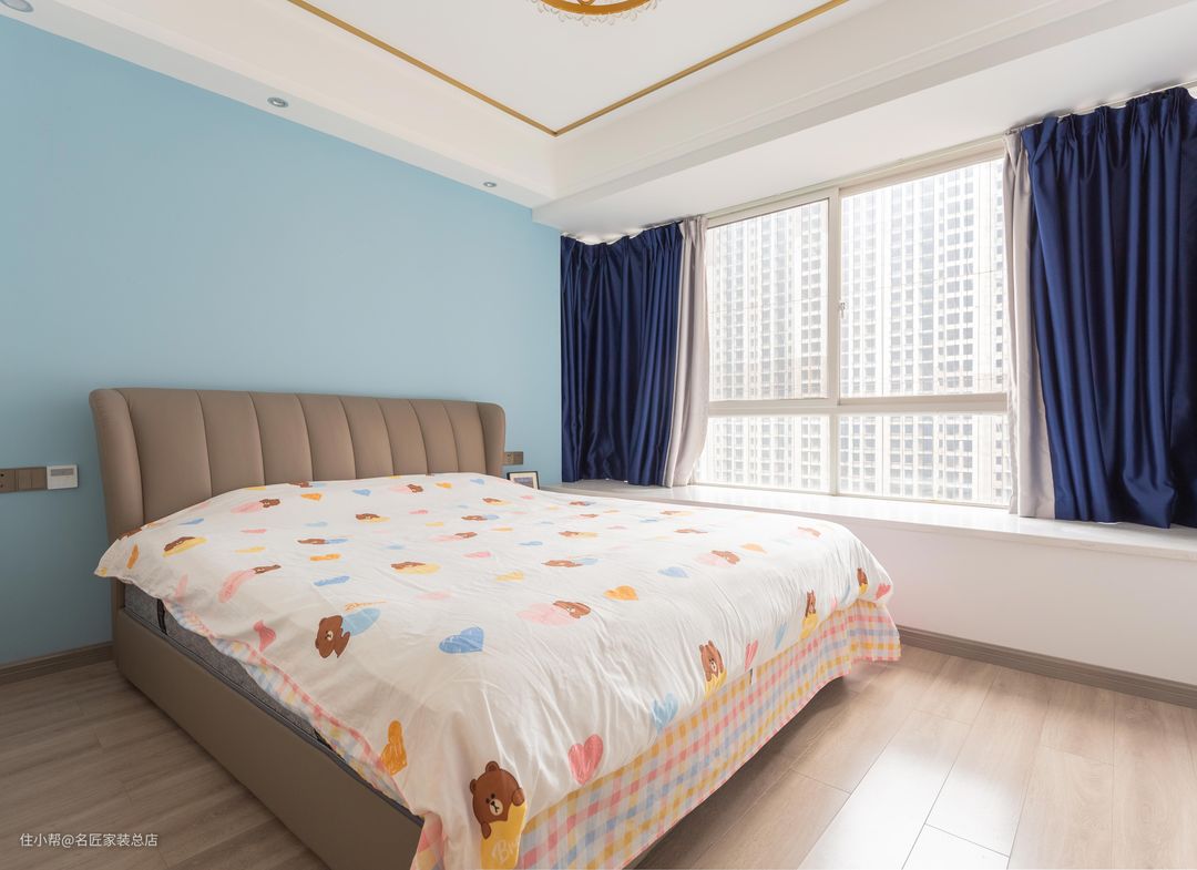 保留飘窗设计可以打造休闲一方,藕粉色窗帘与床品颜色呼应,整体打造一个安静温馨的睡眠环境。