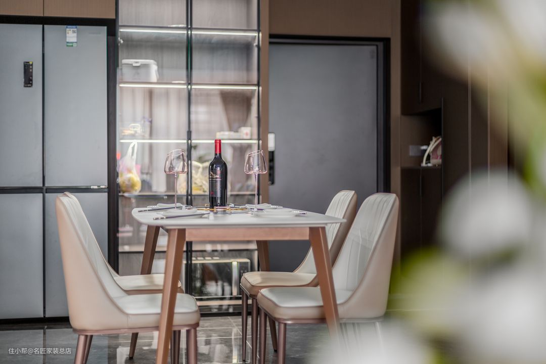 餐厅的风格沿用了客厅的风格,保持了风格上的连贯性,剔透的光源也提升空间空间整体的灵动性