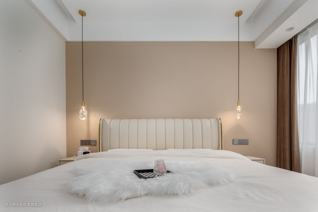 温馨、简单是对卧室的第一印象,床头的粉色背景墙,搭配两个不规则吊灯,加以金色线条的点缀,让温馨的空间多了一丝轻奢的美感。双眼皮吊顶提升层高,在不知不觉中增大空间感。