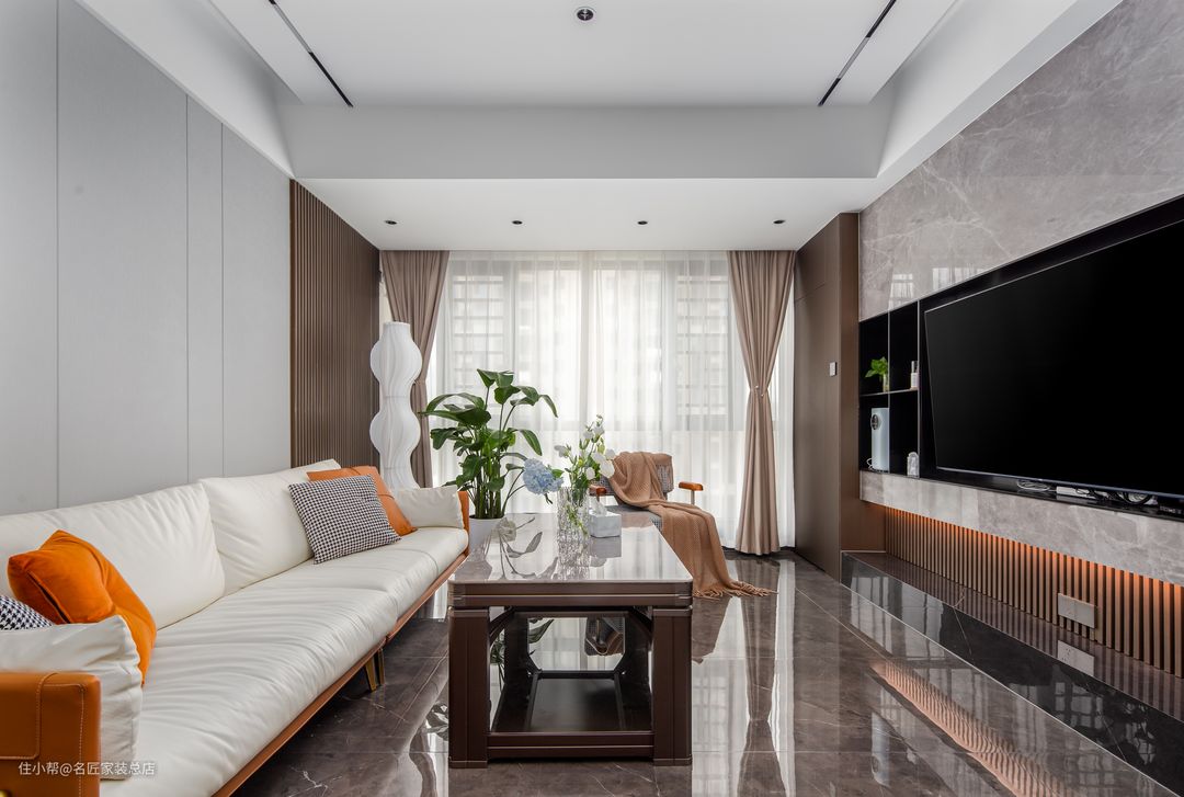 将阳台纳入客厅空间之后,这面大落地窗让这里成为了绝佳的“观景台”。客厅的面积只有30平,四米的沙发在视觉感上得到了延伸,一体式的背景木饰结合木格栏栅增加空间层次感,悬浮式吊顶的运用让空间层次感有所提升,搭配深色地砖整体光感强烈的色调由繁杂变的统一