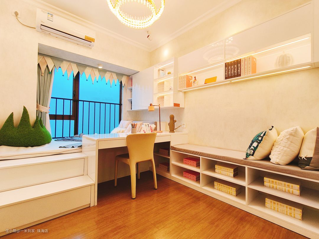 设计师靠墙设计一排的储物地柜,加宽纵深储物设计,拓展收纳空间,大容量储物更方便,开放式收纳空间,满足孩子物品的整理。 奶白色抱枕彰显家居格调,肌理感强,搭配各种家居场景,清新雅致,四季适用。 设计师充分利用空间,在床沿设计长条书桌,占地少省空间,在这片不受拘束的畅想天地中,赋予孩子想象更多可能,任思绪肆意流淌,一方足够实用的小天地,为学习时光注入愉悦心情。床头的悬挂式储物柜探索艺术生活,装饰收纳兼具,给孩子随心置物的空间,预留空间面积宽大,可以放置一些经常取用的物品,或用装饰面、植物盆栽来点缀日常,提升居室的气质。 墙面装饰画参透现代设计理念,具有浓郁的艺术调性,匠心雕琢,营造强烈的空间感,打造时尚轻奢的气息,给浮躁的生活增加趣味和温柔。