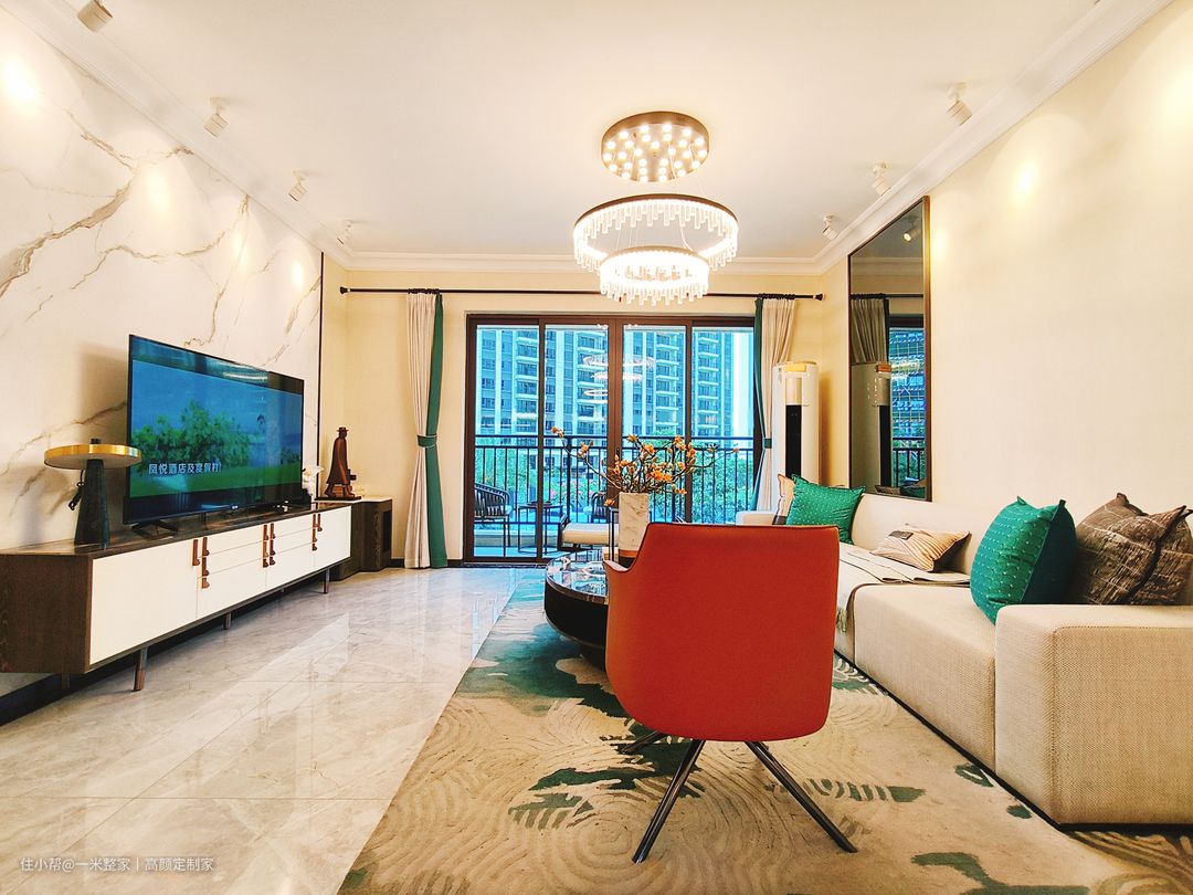 客厅中央是一圆形茶几,圆几桌面采用优质岩板防腐,容易清洁,边缘打磨防磕碰,注重家庭安全,耐磨耐刮又保留原始质感,点金之笔的碳素钢脚支撑,为整个茶几增加奢华的气韵高强度,能稳稳的承托,不易生锈,经久耐用,彰显高品质生活的一种态度。茶几也做储物设计,便于日常物品的存放。后面放置奶白沙发,加大加宽,入座面加长20%,随性而躺,舒适伸个懒腰,拒绝拥挤,弧度扶手,舒适承托,可足够躺下看看书。右侧是橘色单人椅,高弹海棉搭配优质皮革面料,给予户主舒适体验。 茶几上摆放花艺装饰,感知中式气息,为单调的空间带来微妙的色彩和美观。客厅的电视墙选择大理石大板,无大板,不轻奢,多空间运用,切割多重规格,石材大板整体连贯性,1:1原石纹理,视觉空间更开阔。摆脱复杂造型与多余装饰。顶上的水晶吊灯净透不含杂质,透光双层设计让光线更加明亮。