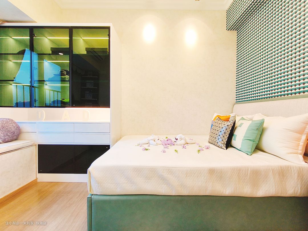 次卧的设计以简洁为主,充分利用了空间的局限性,既方便实用,又美观大方。透过大飘窗进来的光线,自然而然地把温暖旭日带了进来。白色窗纱的设计,光线正好合适,营造了宜人舒适的自然环境。飘窗上放置学习桌,整体造型清爽利落,黑钢细腿更显轻盈,既可以梳妆,也可以办公。 绿色的床垫和绿色波点的床头背景墙,搭配浅绿抱枕,空间的层次感被体现出来,一股子的高级感。飘窗一侧安置储物柜,选用优质框架结构作为基础,表面耐磨光滑处理,稳固承托柜体,放心使用,让杂物统统有归处! 飘窗旁放置矮凳,每一个朝夕,不动声色的陪伴,希望你每天从元气满满的早上开始,稳固却又轻盈,靠背既是拉手,方便推拉到桌底,为您节省空间