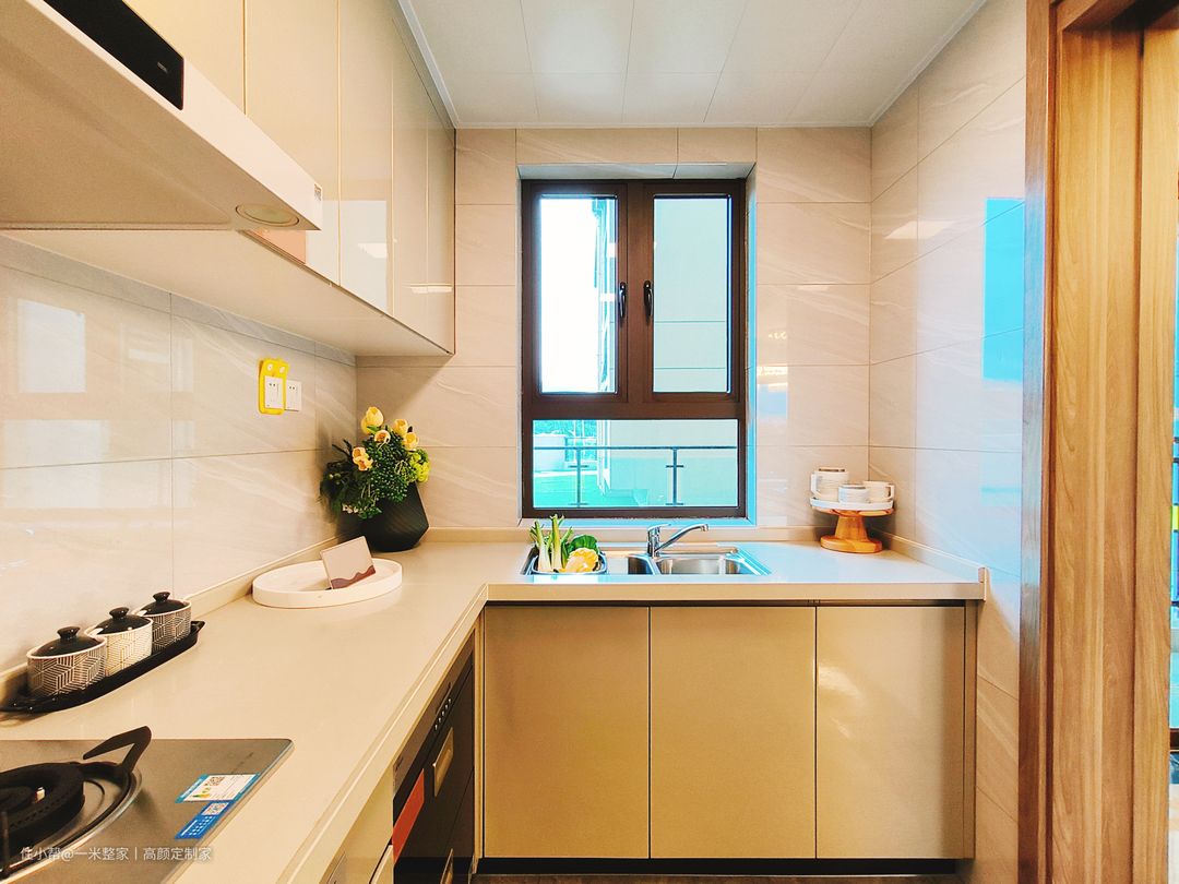 厨房将设计、科技、生活三大工程美学融于一体。厨电嵌入式橱柜,不占台面空间,分类区分,有效扩容,厨房零碎尽收眼中,厨房黄金三角,洗切煮一步到位,菜板水槽一体化设计,边洗边切超方便,底部留10cm的踢脚线,防止柜体发霉损坏。 窗户的位置正好位于水槽前方,这意味着在水槽前清洗蔬菜瓜果会更加明亮通透。橱柜的台面选用了大理石的材质,大理石台面,对于普通的木质台面的打理,表面平整不怕水,直接用湿抹布打理即可;当然沾了点水之类的,也都可以直接擦干,偶尔水杯流出几滴水到台面上,也不需要担心,让其自然干即可。