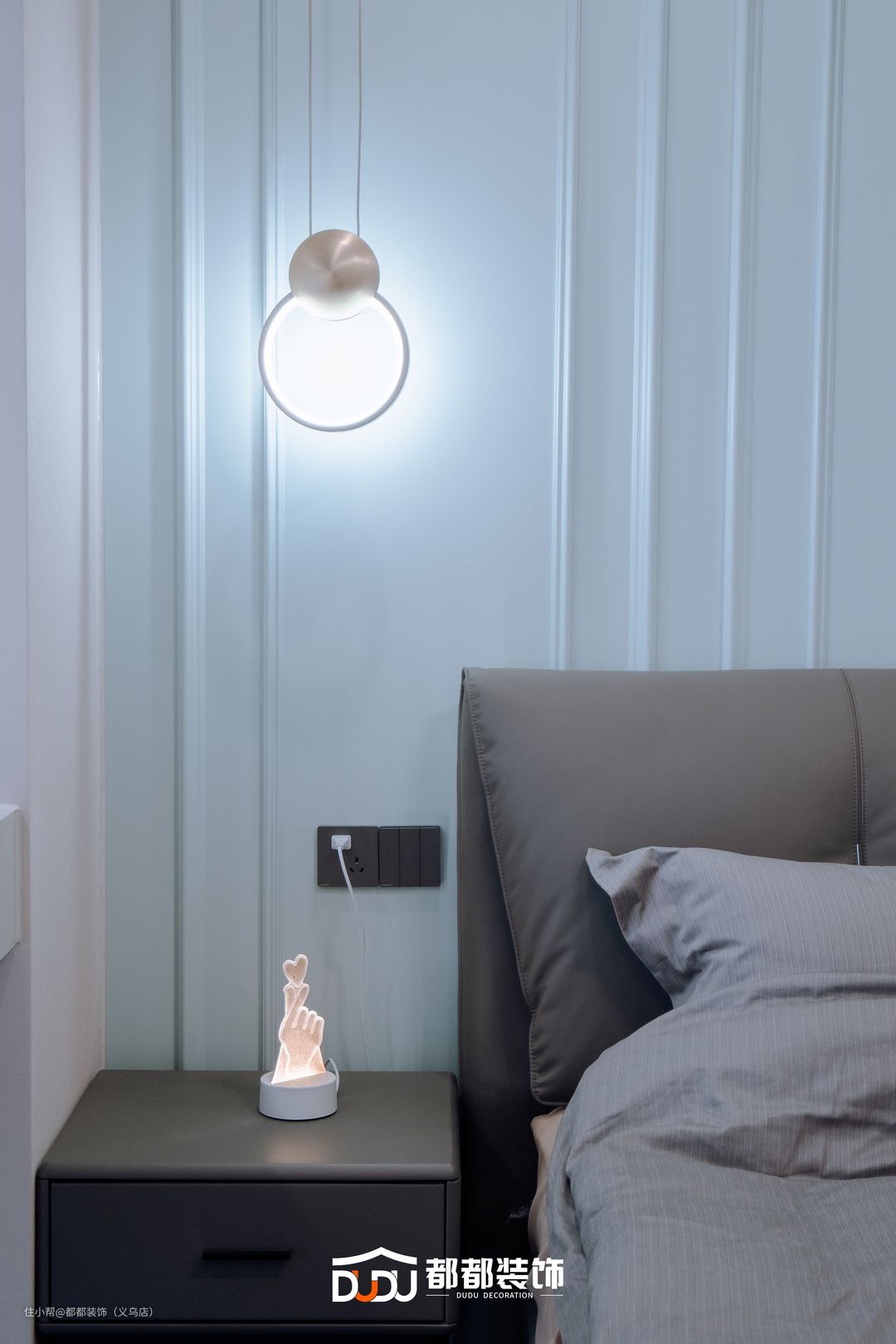 次卧通铺灰色大块瓷砖,结合大白墙与石膏线造型设计,打造温润自然的空间;双眼皮无主灯的设计,使得天花不仅耐看也更开阔。 灰色的大床铺上同色系的床品,打造温馨沉稳的睡眠空间;一侧的圆形吊灯极具特色,彰显细节质感。靠墙一侧一字型的衣柜,既提高了卧室空间的利用效率,也让整体动线布局更融合,协调美观。