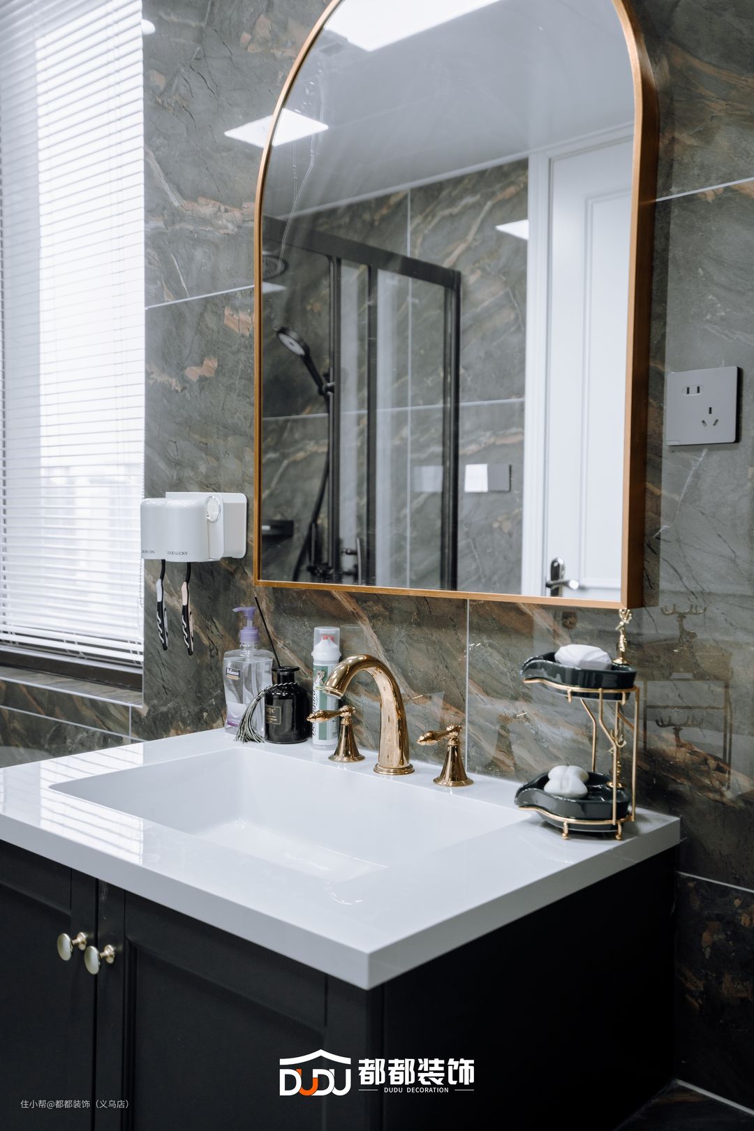 利用黑框玻璃门作隔断,既不影响视觉与采光,同时也可以很好地实现干湿分离的设计。单人位的洗手盆与大台面结合,可以摆放洗漱用品,台盆下是黑色的收纳柜,为主人卫浴洗漱提供方便实用的空间。 黑褐色的大理石与白色浴缸相结合,加上流线型的设计元素,让主人在这种浴室沐浴简直是一种享受。马桶区上方还打造壁龛设计,放置小型绿植,给卫生间增添一丝清新的氛围。