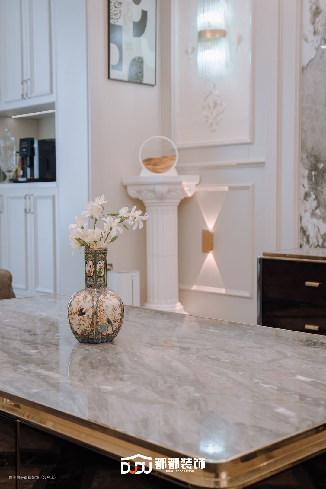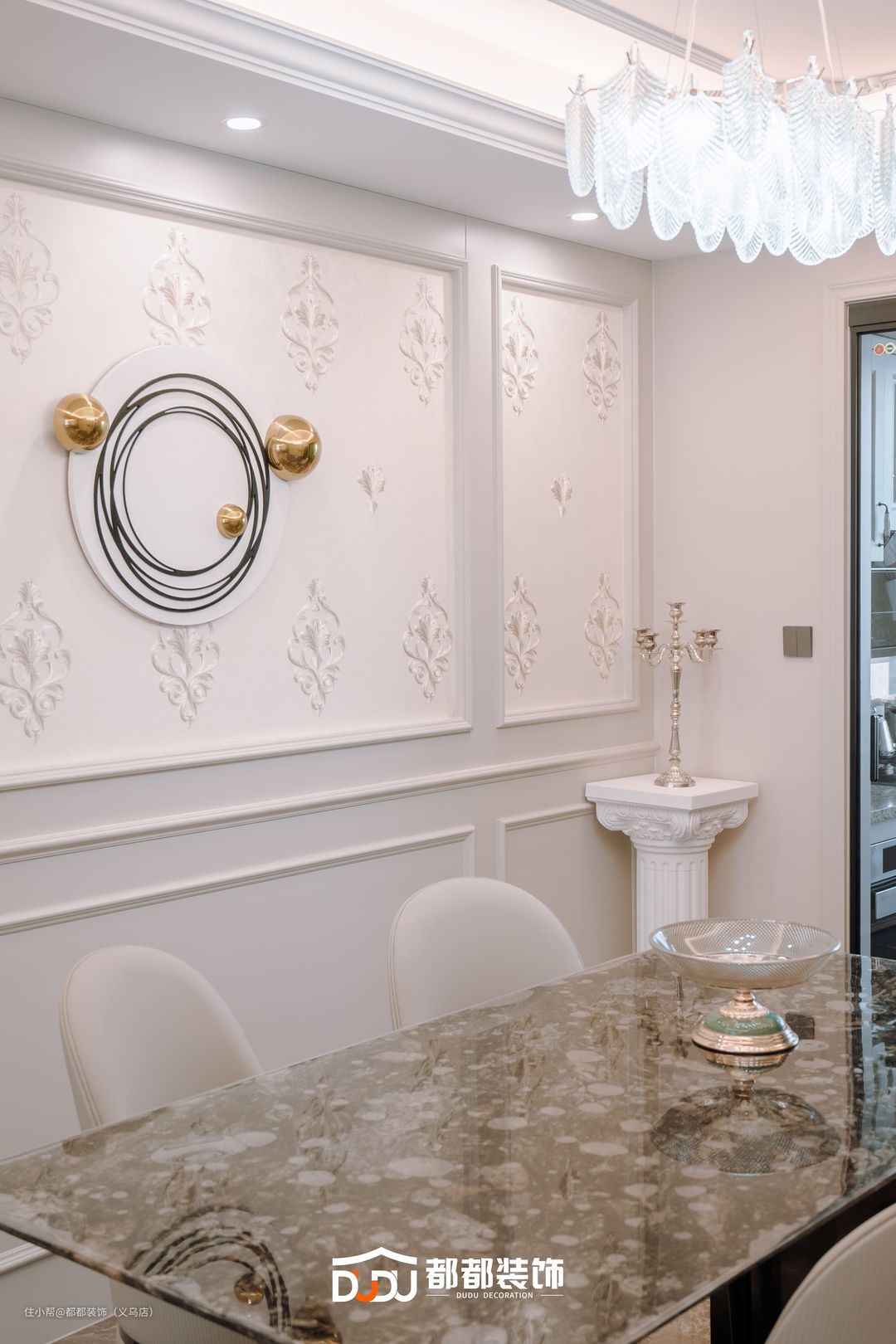 方形的大理石餐桌配上白色皮质餐椅,清新脱俗;桌上的玻璃碗与天花板上的水晶灯相得益彰,氛围感瞬间提升,打造温馨浪漫的用餐氛围。 餐厅一侧打造顶天立地式的餐边柜,造型简单大气,封闭式+台面+开放格的组合不仅轻松收纳物品,也可摆放常使用的杯具以及各种精美小摆件。 另一侧是石膏线与立体花纹相点缀,与客厅设计相呼应;并悬挂造型有趣的摆件,艺术感满满。