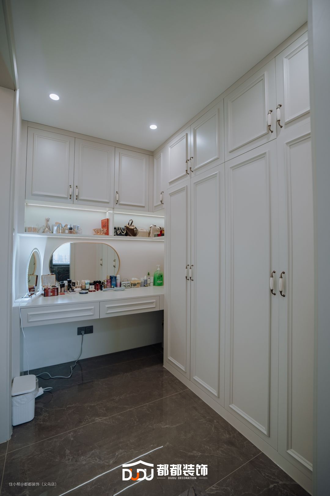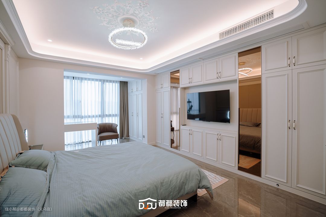 床头背景墙利用石膏线条与立体造型装饰,中间利用木饰面进行过渡,不会显得单调刻板,轻易彰显法式的代表性元素和独特气质。 米白色的皮质双人床,质感十足,铺上湖蓝色的床品,尽显温馨浪漫之感。床头两侧对称式的台灯,散发出温馨迷人的光芒。 床尾打造一整面的柜子,可以轻松收纳夫妻二人一年四季的衣物;中间安上电视机,可以让夫妻二人一起看个影视剧,彼此可以交流,增进夫妻感情;两侧对称式的镜子方便主人整理衣物。 主卧拥有独立的更衣室和化妆区,用来收纳女主人的衣服、包包和鞋子,还可以在这边梳妆打扮,实现衣帽间+梳妆间自由。