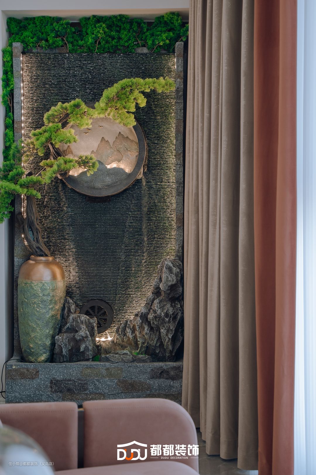 用简洁流畅的石膏线条与立体花纹造型来增强装饰效果,使得整体看起来就很有艺术感,以及视觉延伸的效果,恰到好处地凸显出法式的魅力。 在双眼皮吊顶基础上,四周添加石膏线,效果更有层次感,空间有立体感;当叶子造型的水晶灯光散射在客厅的每个角落,为整个空间了一层水晶光泽。 简单的咖色布艺沙发,造型饱满,外边柔软,触感温和,坐卧舒适。结合黑色金属框+灰色台面的茶几,整体色调和谐统一,既不显张扬,又达到现代时尚效果。 电视墙同样是石膏线的设计,不过中间配上了灰色纹理的大理石,两者混合应用,打造出奢华有质感的空间。 利用墙垛将客厅与阳台做隔断,布置上驼色沙发椅与小茶几,打造成休闲区域,日常在这里和亲朋好友谈天说地,很是惬意,拉开窗帘,还能感受外面的美好世界。 阳台一侧摆放新中式的水幕墙,其上装饰有迎客松、花瓶、假山等元素,结合隐形灯带设计,非常精美,富有艺术气息。另一侧则定制与玄关风格一致的柜子,上下储物柜轻松收纳物品,中间镂空位置摆放咖啡机,生活简直不要太美好。