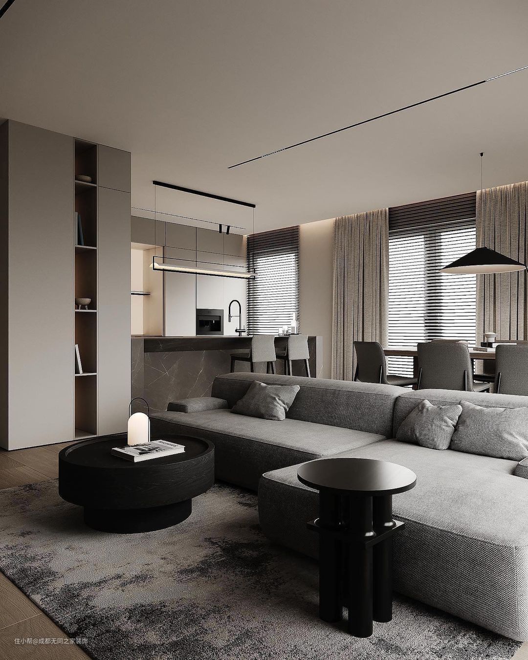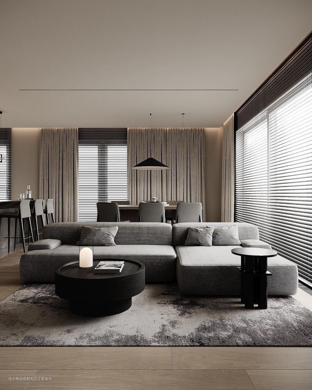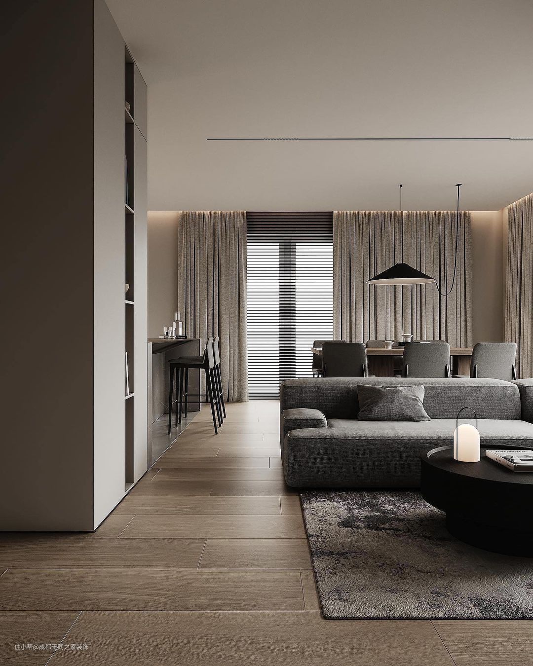 客餐厅一体设计,餐桌在沙发后方,同样是木质餐桌自然平和,有较大的罩灯带来用餐氛围感。