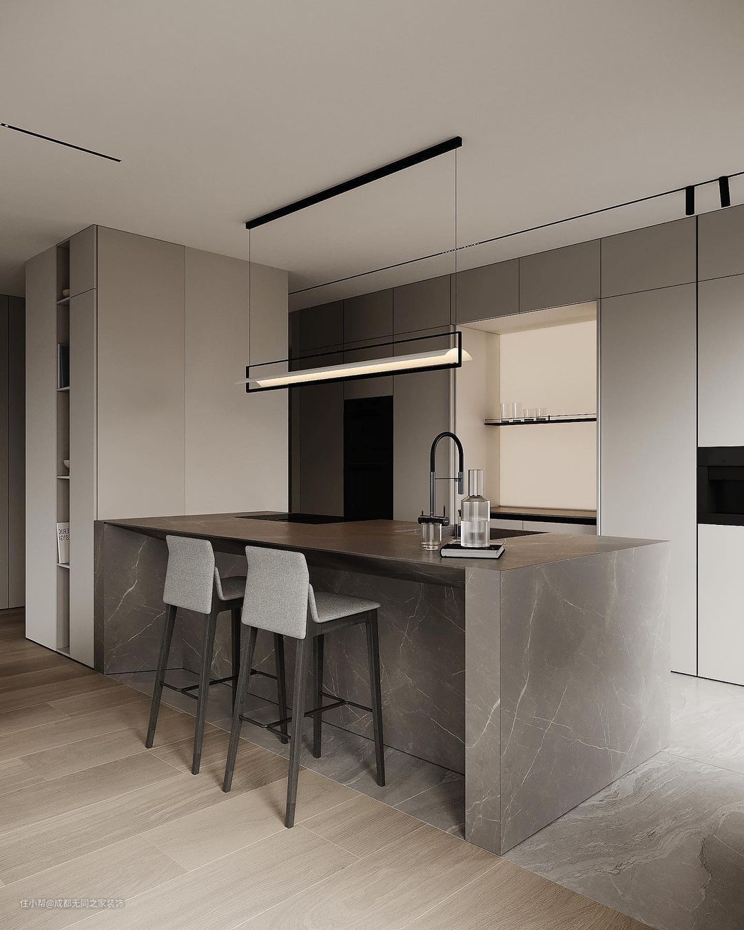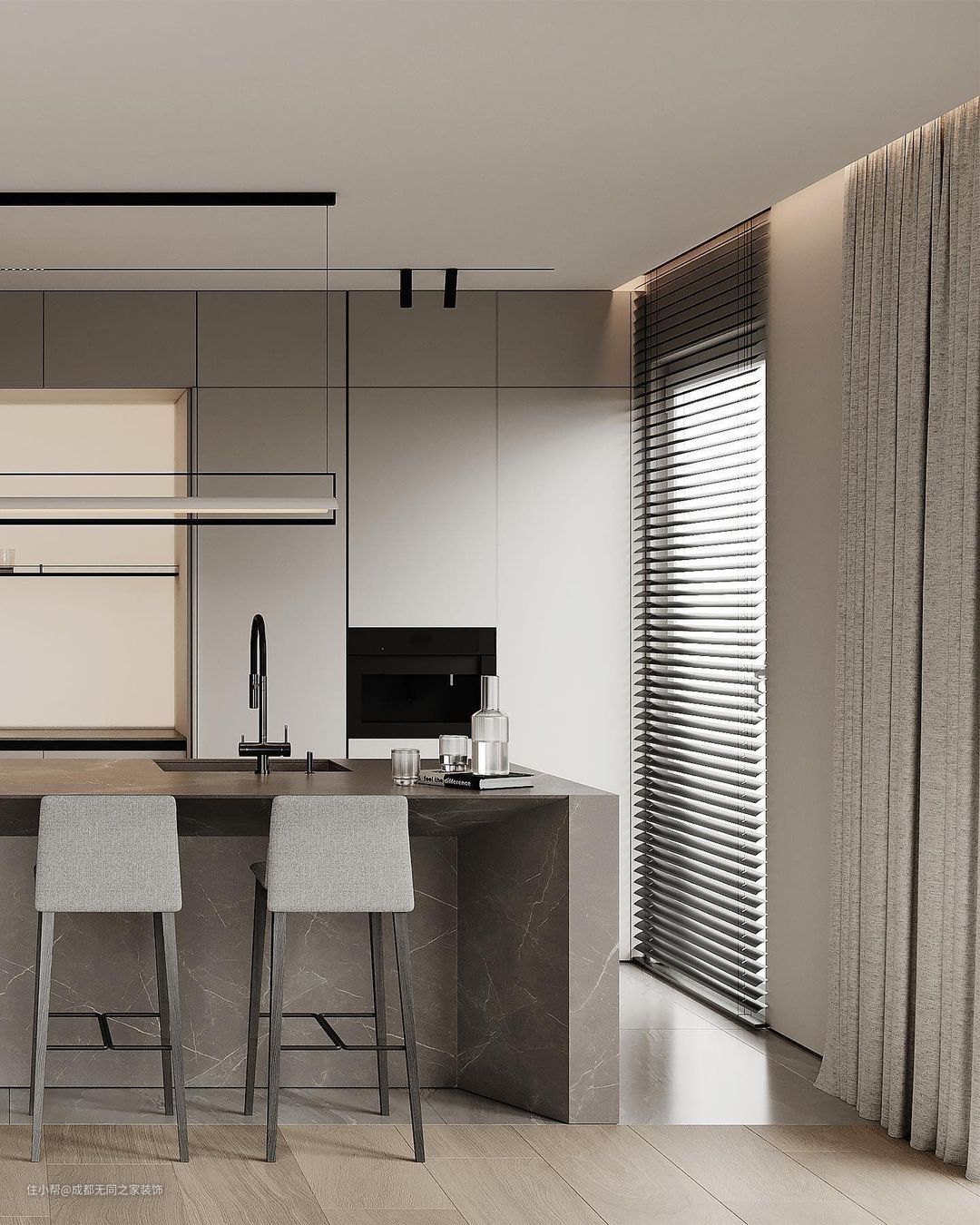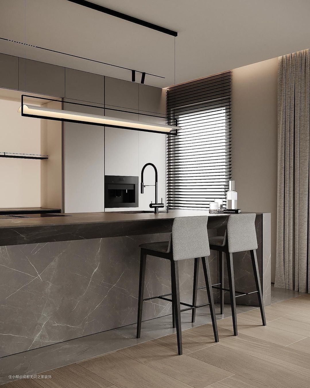 开放式的现代厨房,全套木质橱柜有格调。中岛台外面部分做了高脚凳位置处理,可容纳亲朋好友就坐交谈。