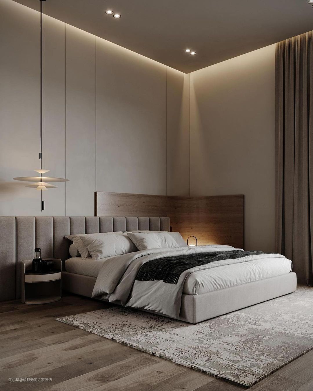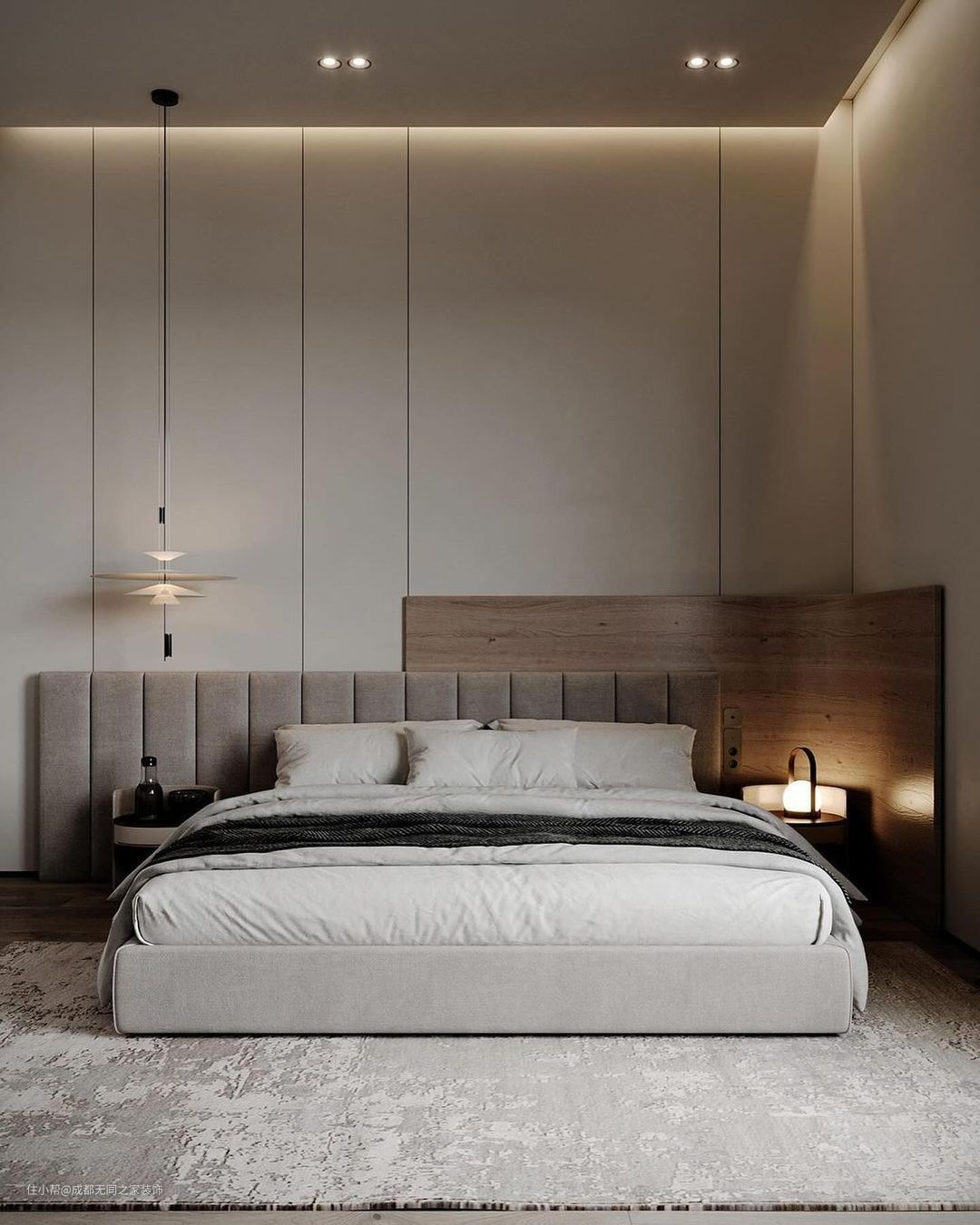 客厅同款木饰面板墙壁装饰,床头氛围灯赋予睡眠空间温馨静谧,床头软包睡觉更舒服。