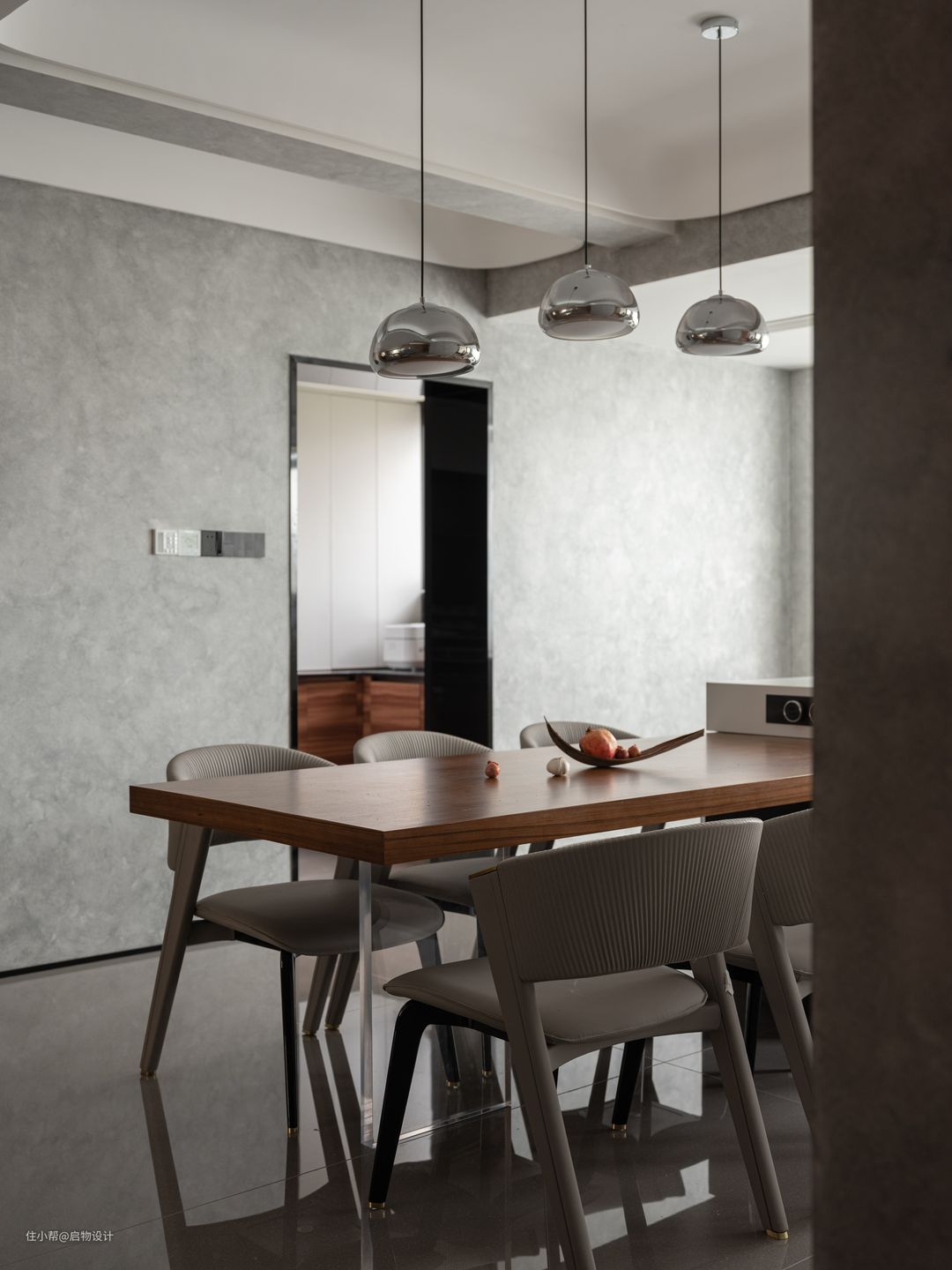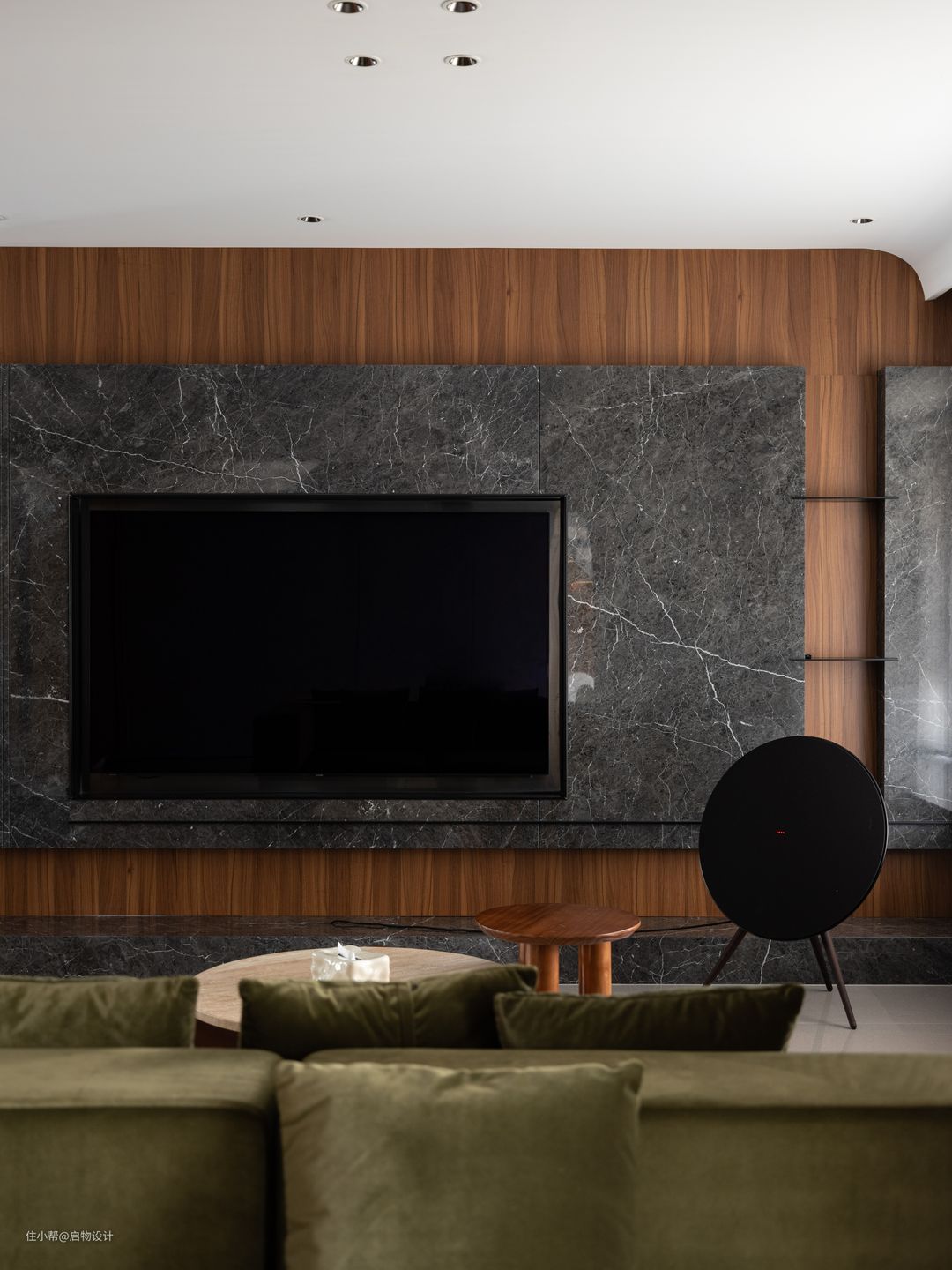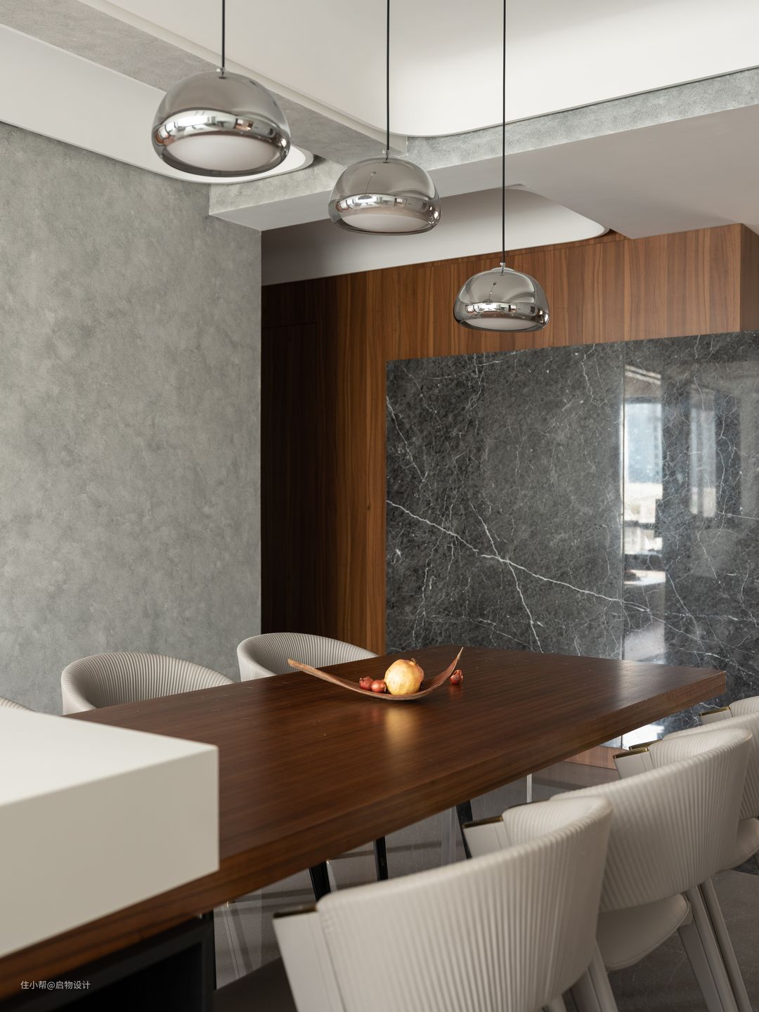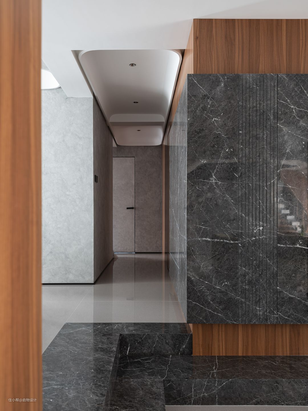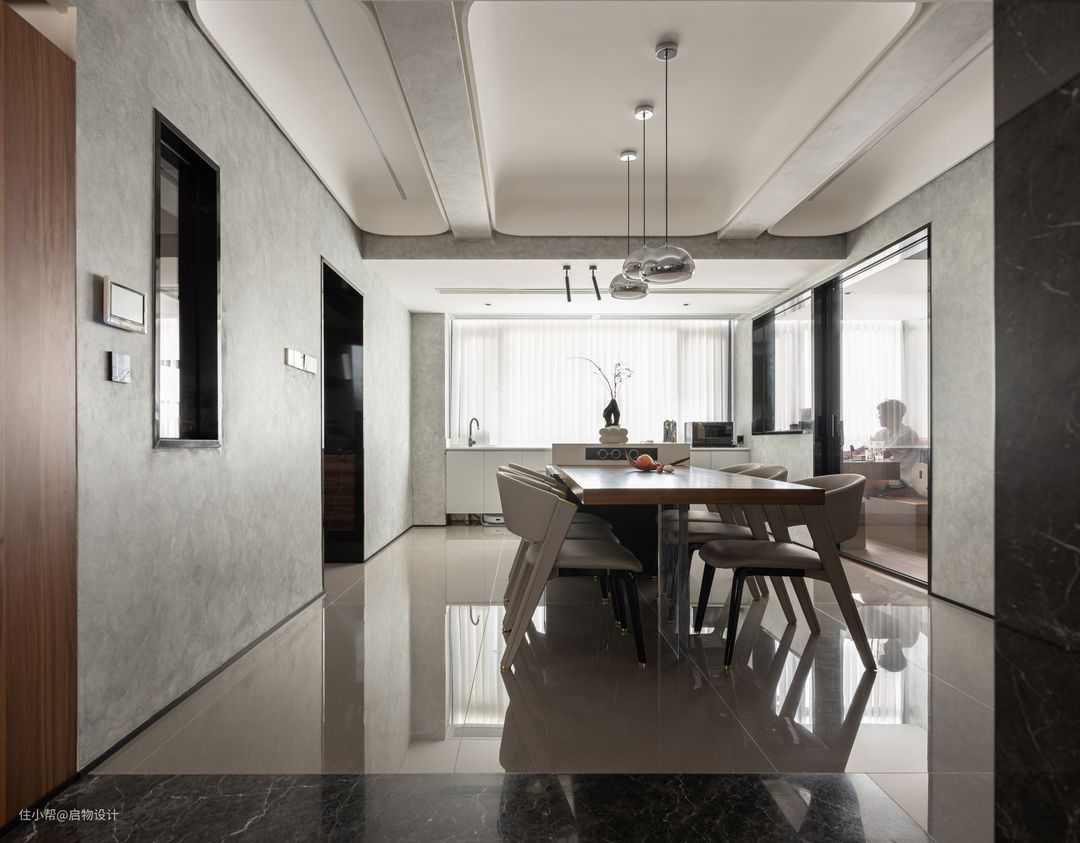 结合两位屋主的审美喜好,空间定调现代意式轻奢风,通铺光滑大理石地面,映射空间的每一寸景致,沉稳木质和绅士黑相互衬托时尚空间,搭配流线型结构和漫光源,更显自然大气。 比起简单的协调,冲突的美感更具张力和吸引力,细腻温润的胡桃木与粗狂冷峻的大理石搭配相得益彰,通过材质独特的纹路散发出高雅低奢的质感,同时穿插重叠交错的结构形式让背景墙极具呼吸感。 由水泥艺术漆代替白墙延续生活的美与丰富,具有凝聚力的装饰主题从公领域贯穿至私领域,有效地将所有区域统一为一个自由流动且有序的空间。