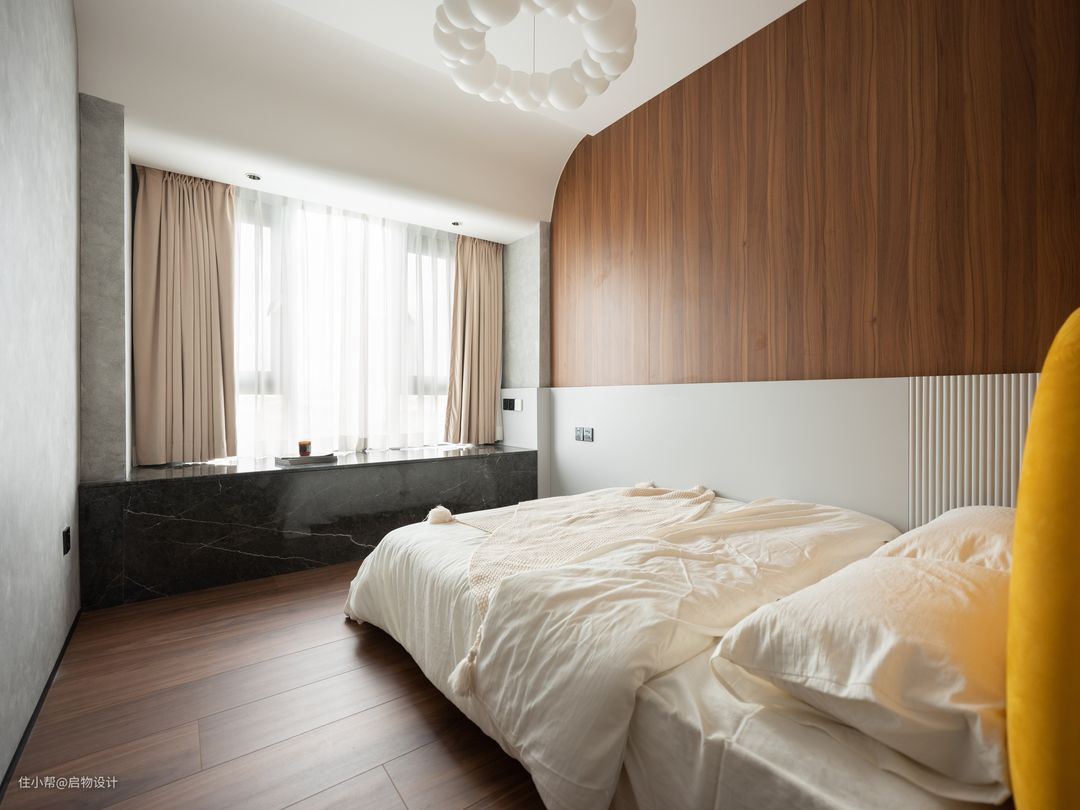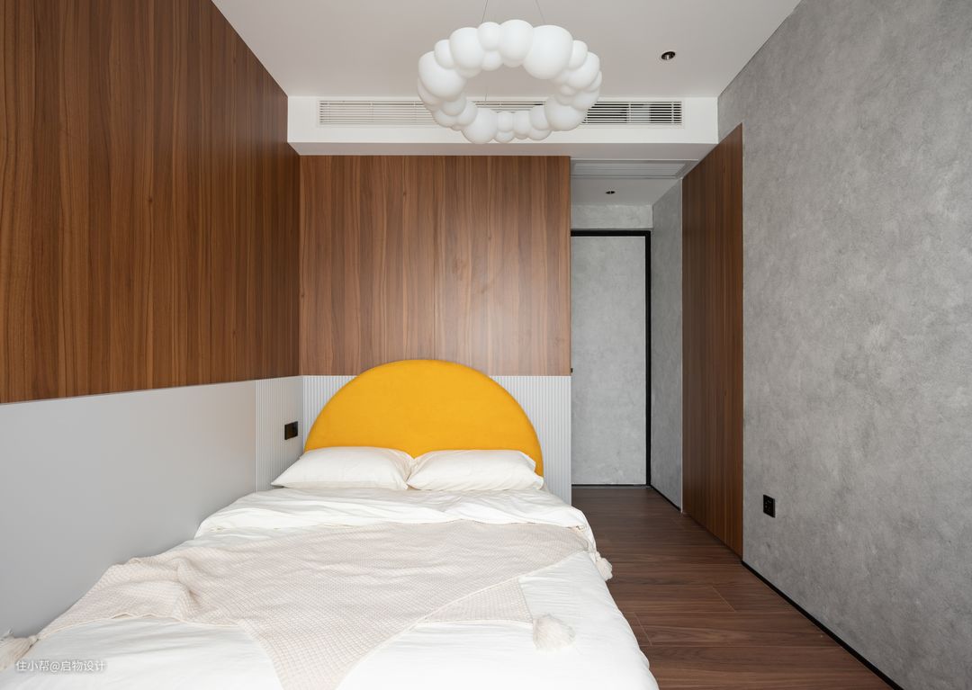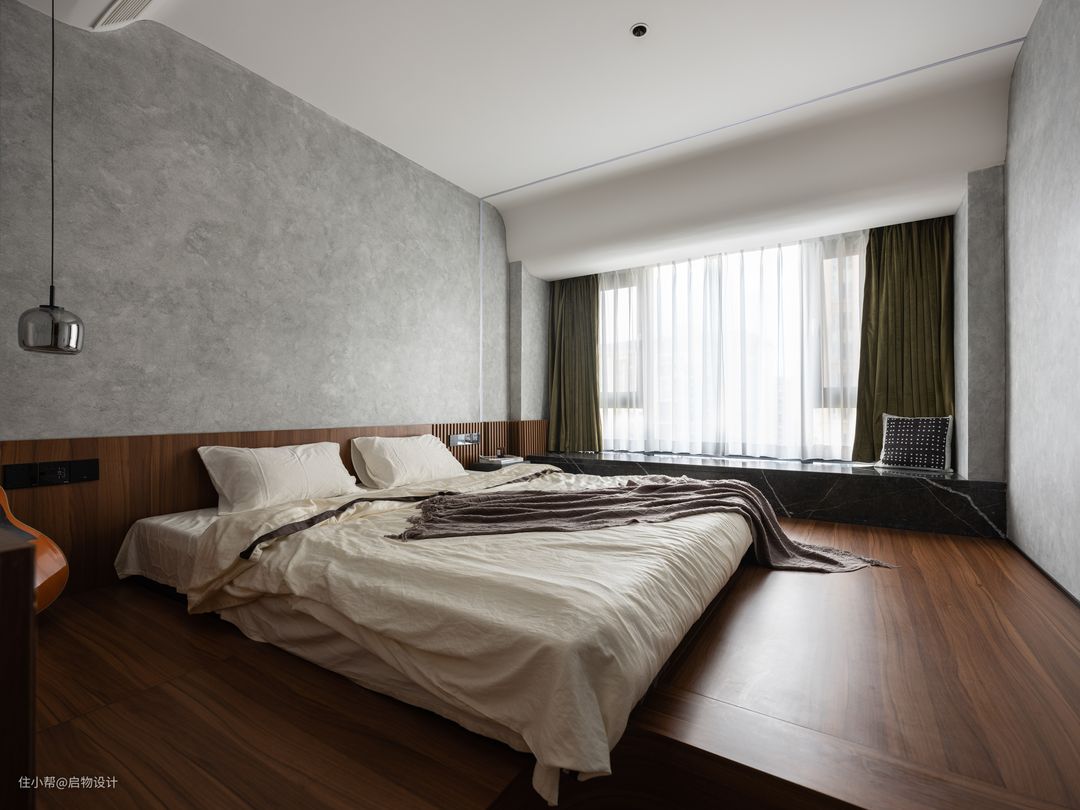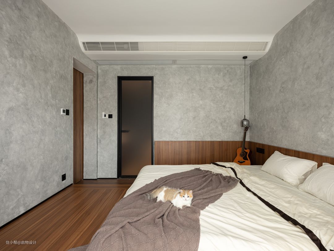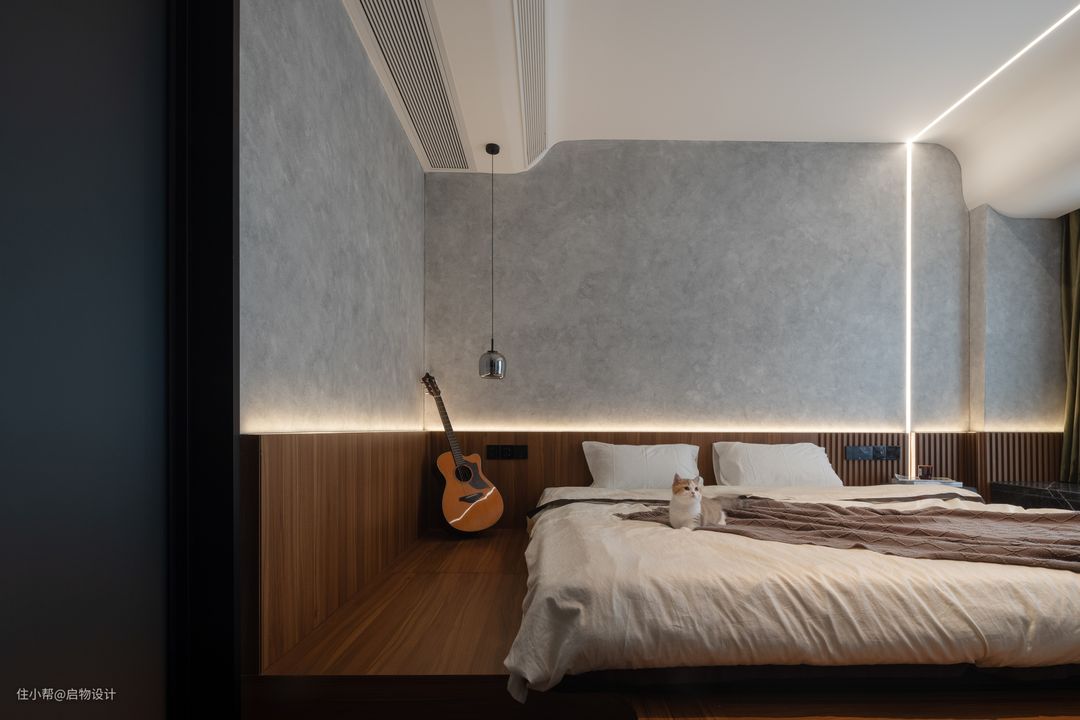 一体化设计让视线得以延伸扩展,由素净自然的材质肌理与线性漫光源围合高级、慵懒的舒适氛围。藉由木格栅以及线性灯的几何穿插强化背景细节质感,让墙面更具层次和艺术感,构筑自由灵动且富有想象力的气质空间。卧室与步入式衣帽间的分隔采用更节省空间的的木质谷仓门,主卫则采用更显高级质感的灰油砂玻璃门。