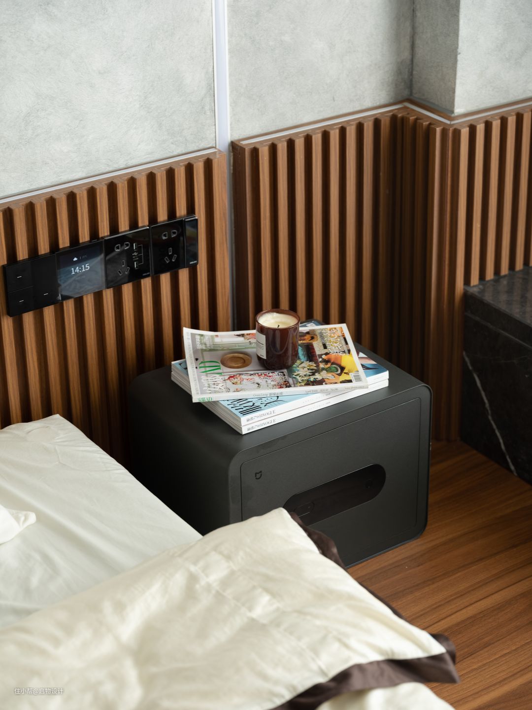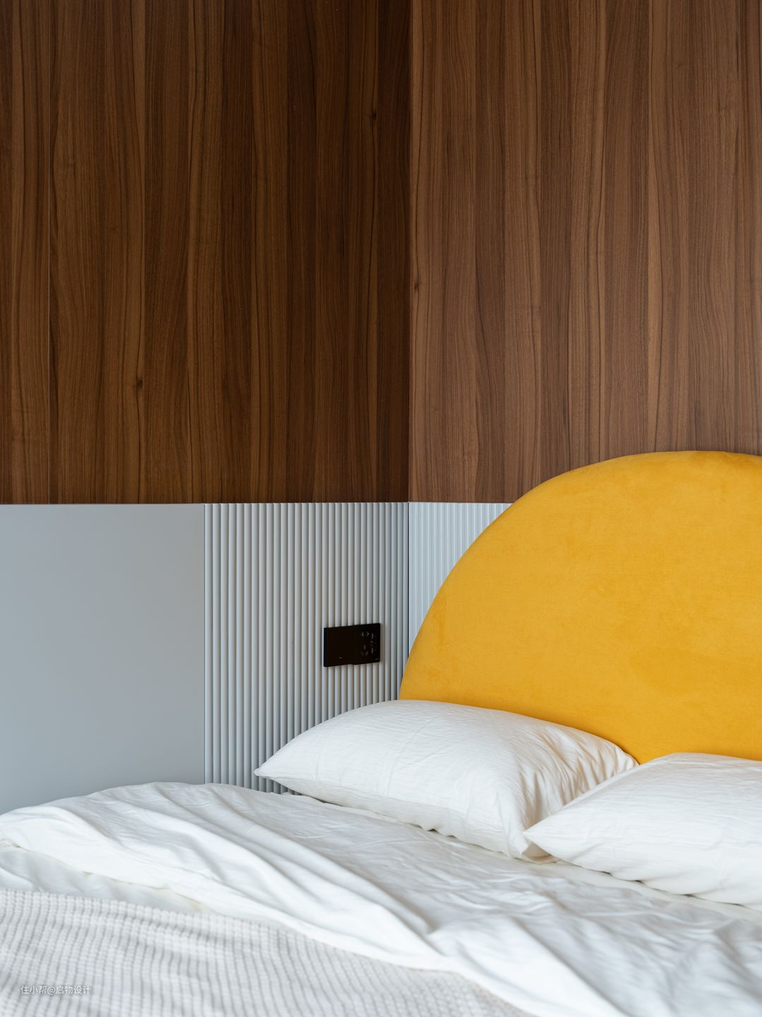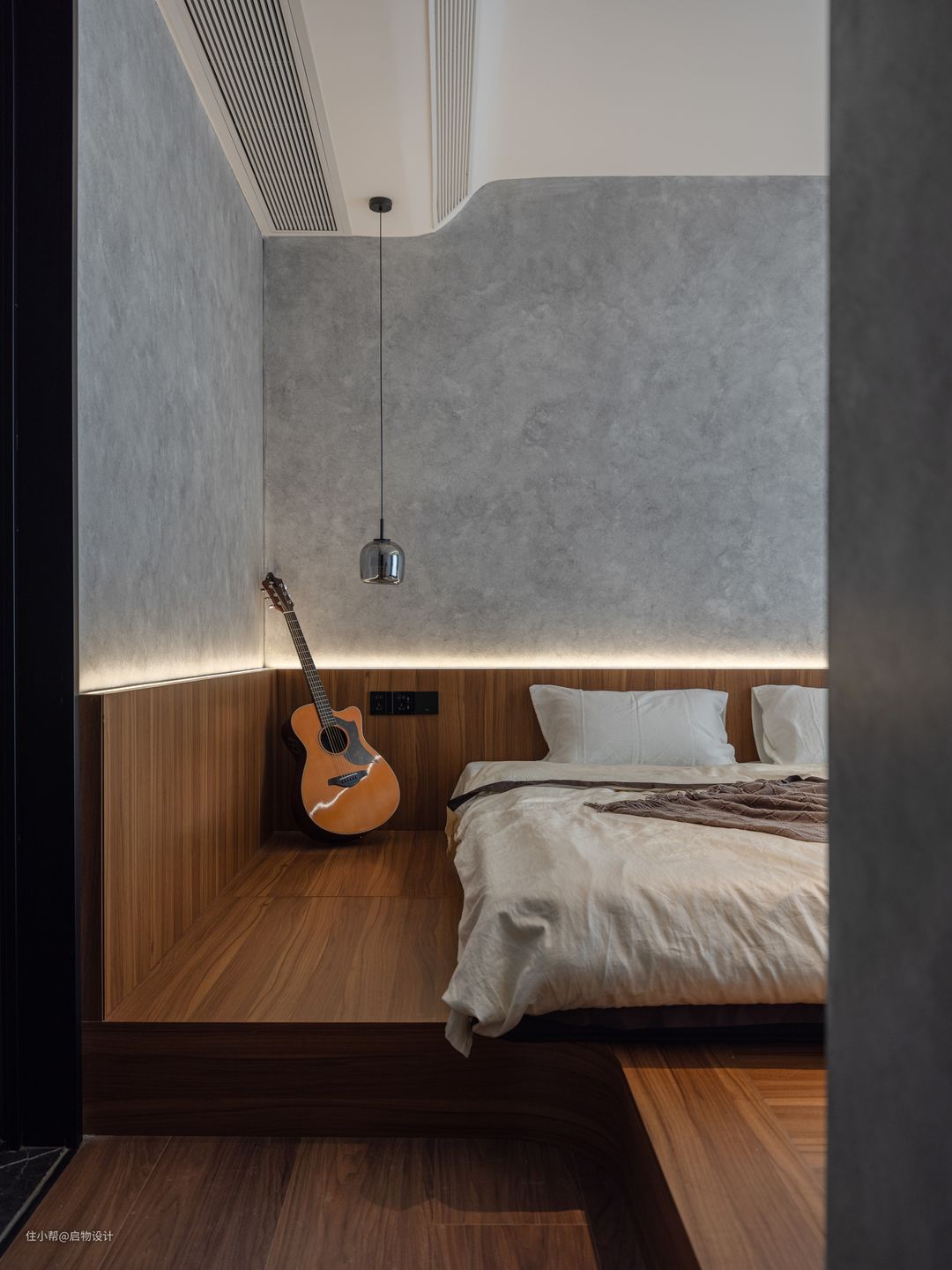 一体化设计让视线得以延伸扩展,由素净自然的材质肌理与线性漫光源围合高级、慵懒的舒适氛围。藉由木格栅以及线性灯的几何穿插强化背景细节质感,让墙面更具层次和艺术感,构筑自由灵动且富有想象力的气质空间。卧室与步入式衣帽间的分隔采用更节省空间的的木质谷仓门,主卫则采用更显高级质感的灰油砂玻璃门。
