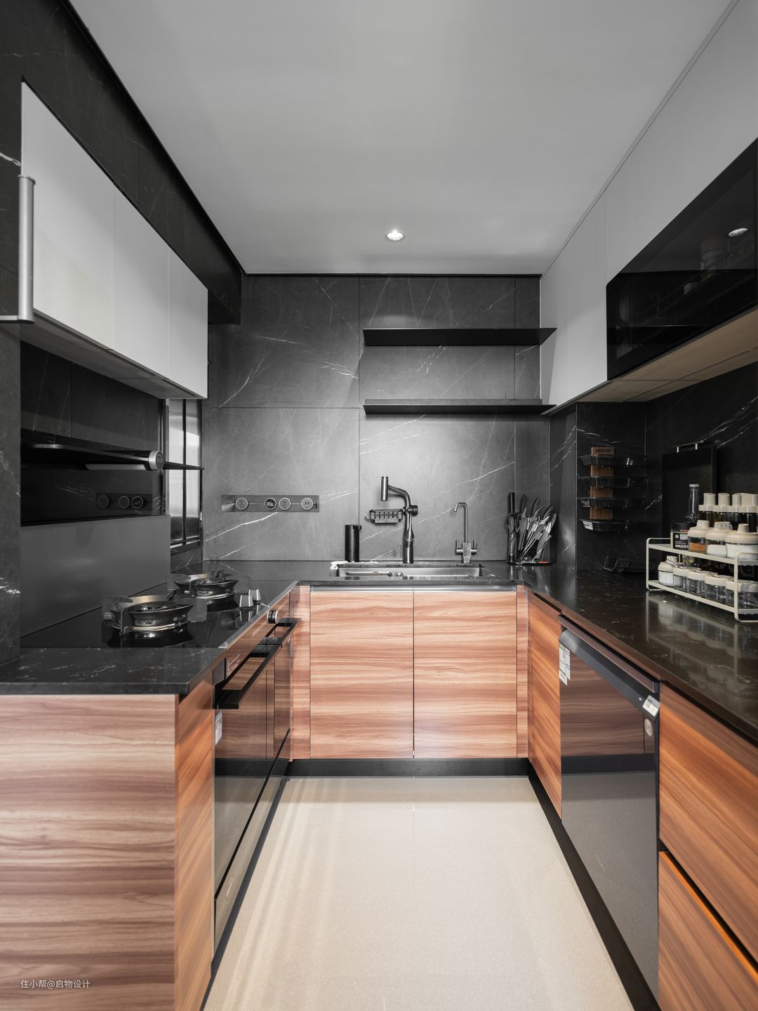 长条形厨房藉由u型布局完备功能释放高效动线,由水管和冰箱断开的另一侧补充收纳以及小家电的使用操作平台。