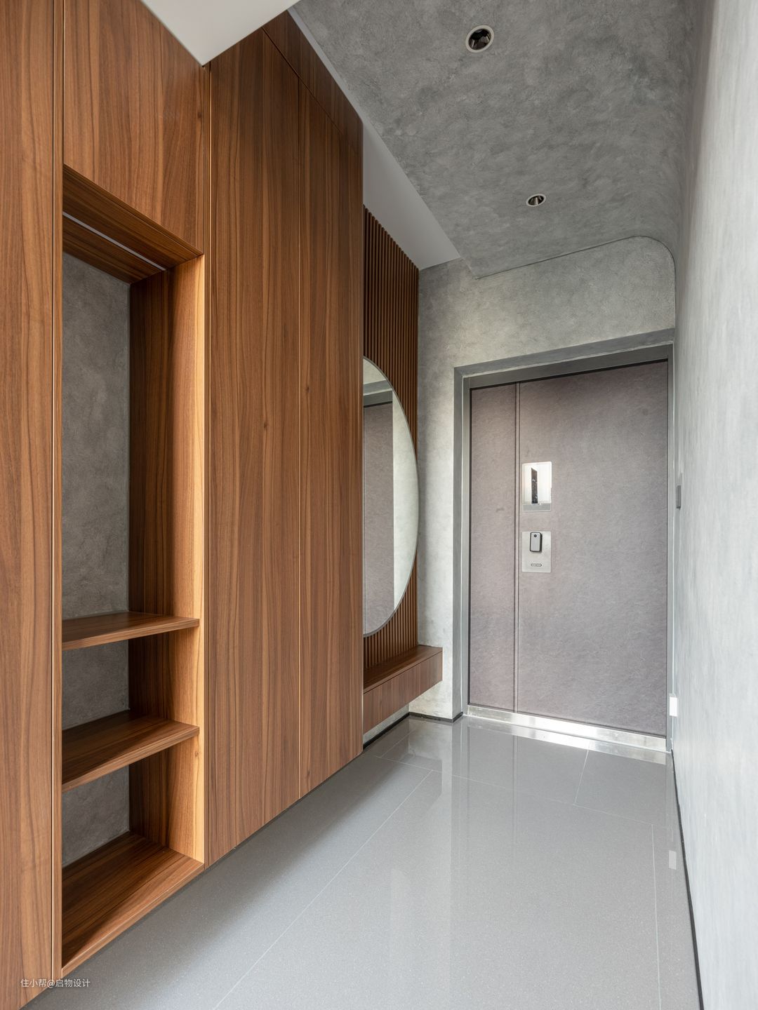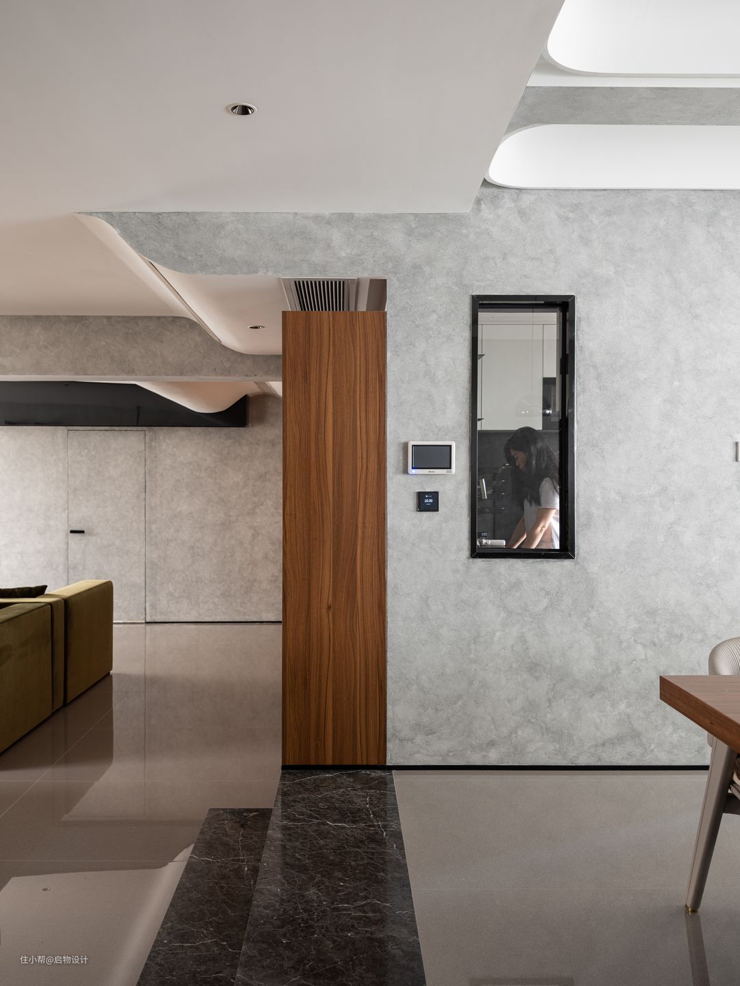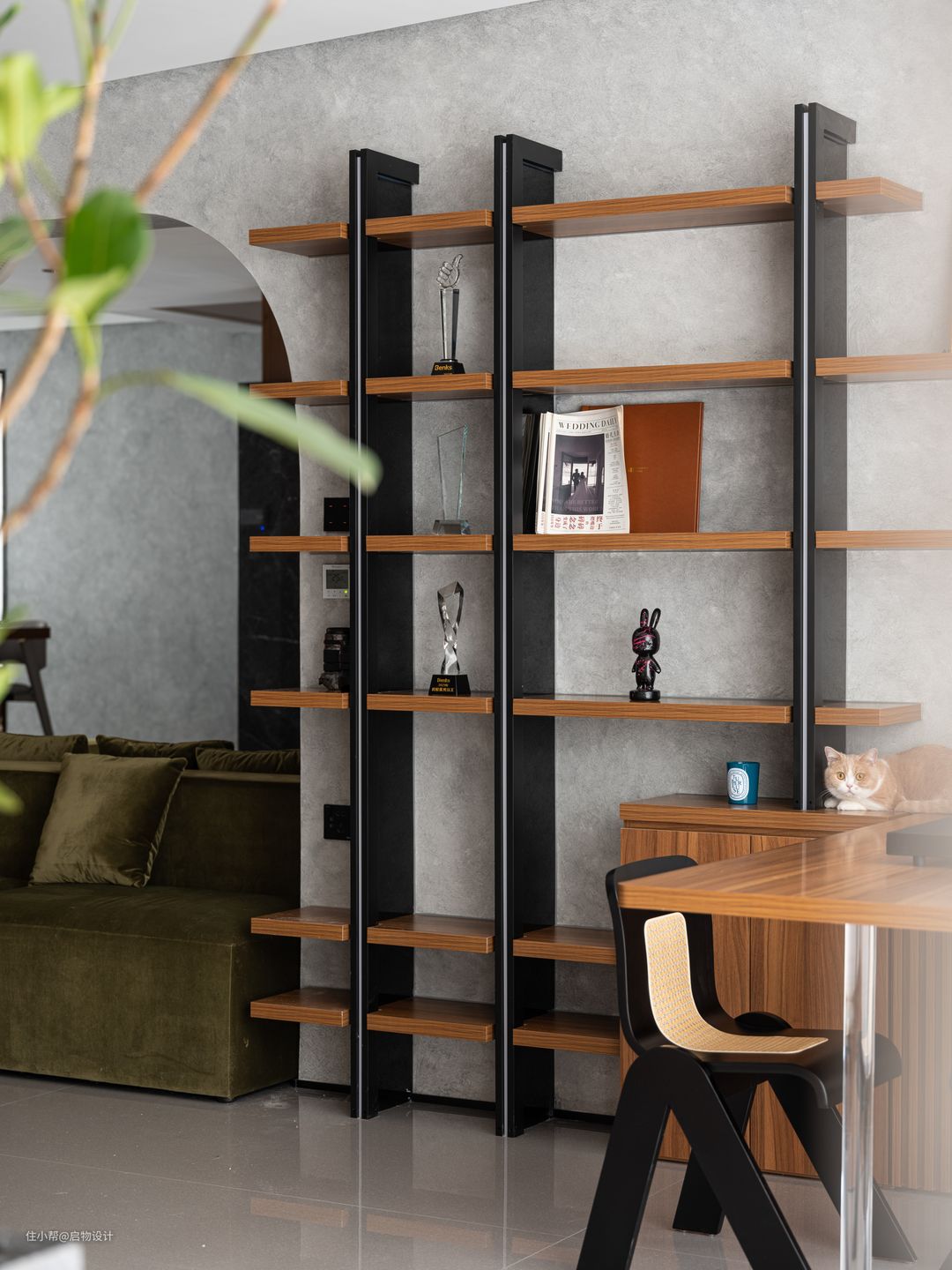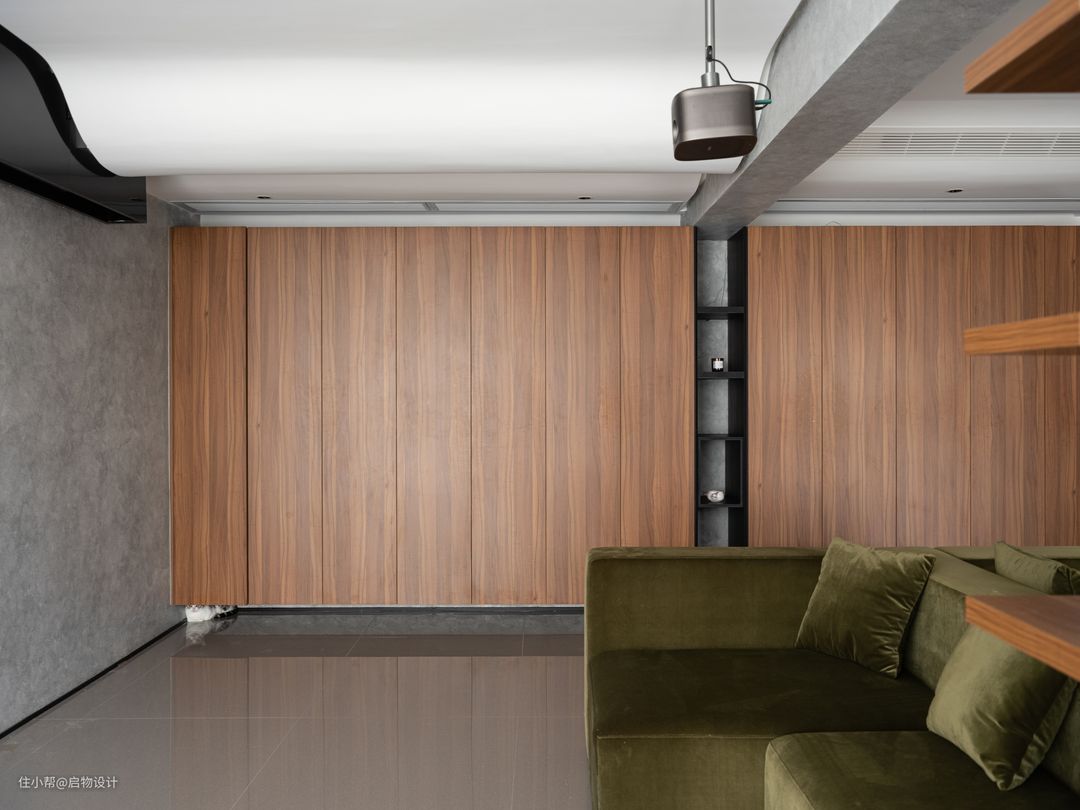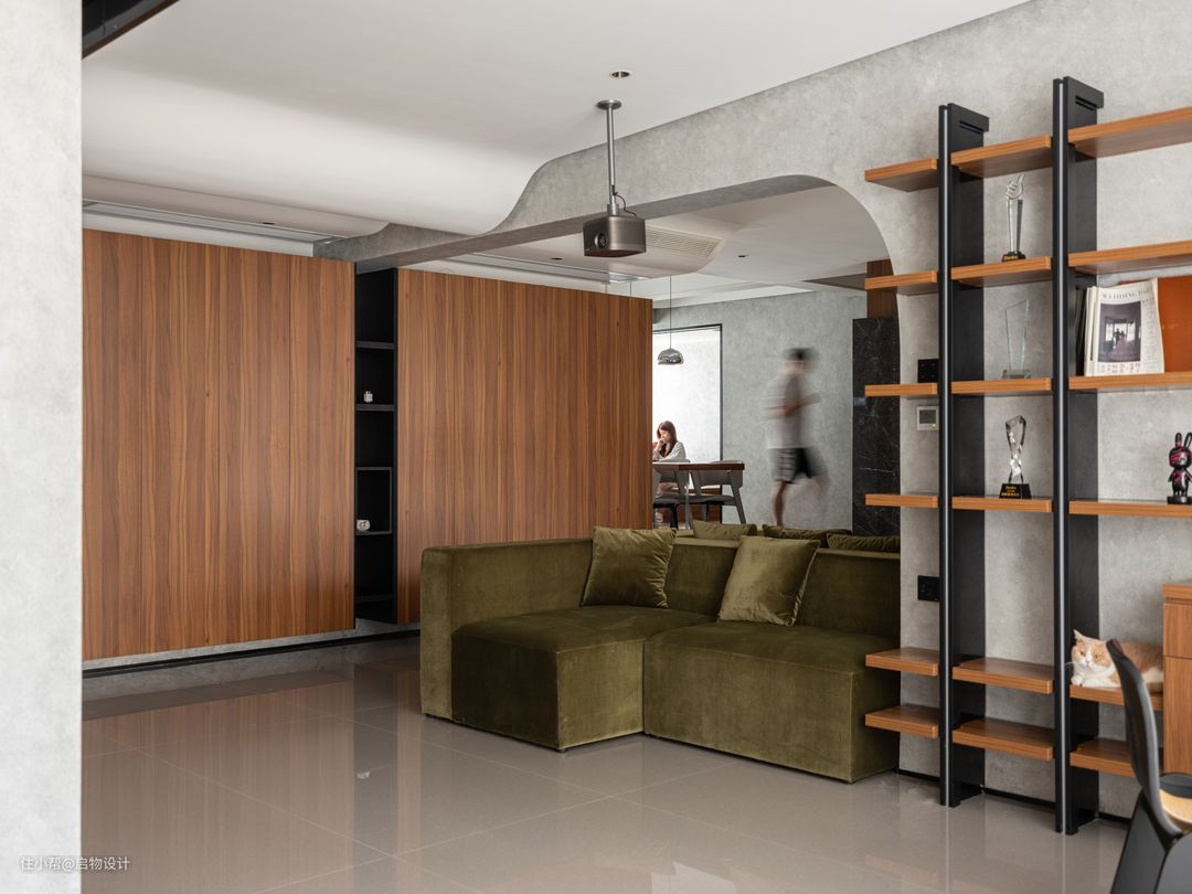 作为过渡空间,玄关更注重功能性,沿墙而设的将近4米功能面释放走廊动线,合理归置衣物鞋帽等进出物品,好取好收拾。靠大门处预留2/3的大圆形镜搭配木质格栅板,与映射的水泥艺术漆墙面围合装扮整理区,同时也是女主人运营穿搭博主账号的主拍摄背景,简单又不失格调。 由展示墙与半高柜和书桌组合的多功能空间,目之所及皆彰显主人的气质格调,桌上摆上茶台,是满足主人会客公办的商务区,也是家人宠物陪伴、休闲品茗、惬意阅读的午后时刻。