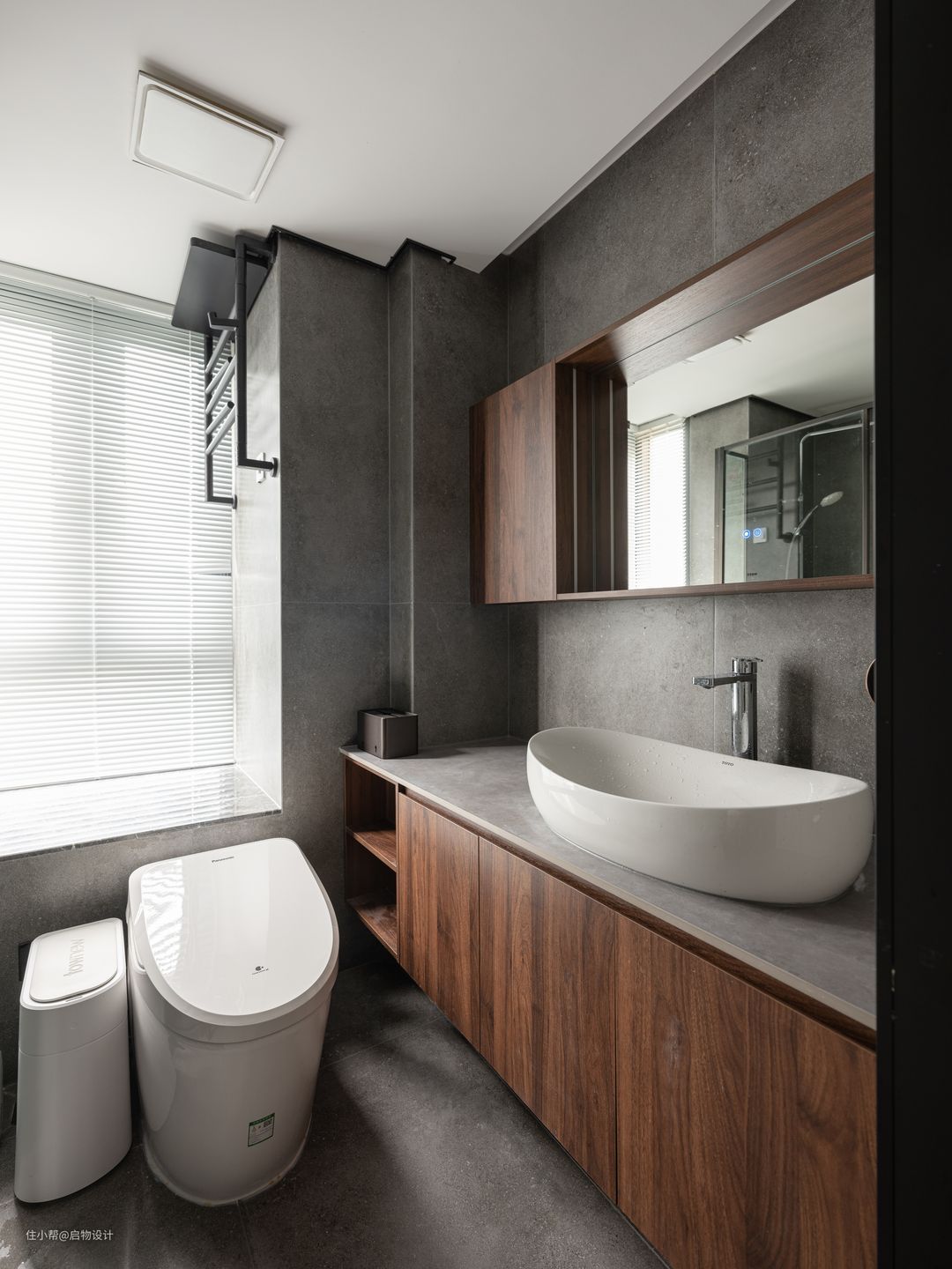 公卫藉由儿童房进门过道和径深的缩小增加了1平方,实现较为舒适的二分离卫浴,兼具实用与美观的浴室柜延续了主题配色,胡桃木与灰阶石材搭配简约大气。