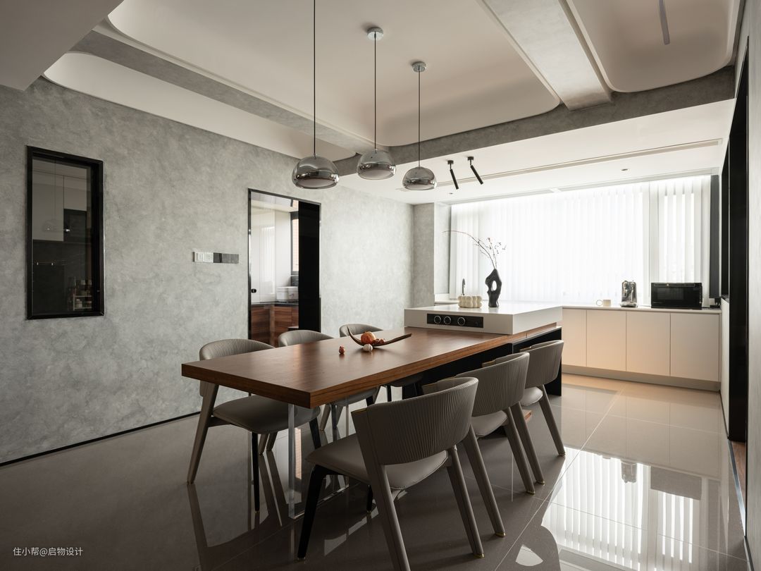 电视墙的装饰结构转折延伸,串联起餐厅、走廊、卧室等丰富场景,皮革金属、石材木纹等轻奢元素糅合其中,诠释坚硬与柔软,广阔与细腻,铺陈出一幅流光潋滟的意式美景。 1.4m的岛台+2m的大餐桌承载着主人对生活的无限热爱和期盼,是与亲朋好友的欢聚一堂以及每一顿精心准备的美味佳肴。