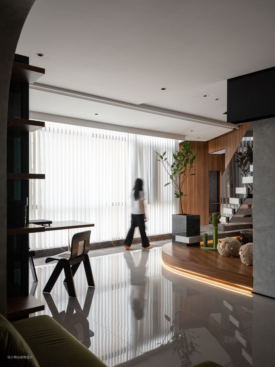 封入户阳台之后增加了玄关和一个开放书房的空间,将近五米多的采光面设计一处兼具商务与休闲的区域,转角楼梯处则穿插弧形地台连接至储物间,消弭异形空间的鸡肋角落,释放观赏性和功能性并存的过渡区。