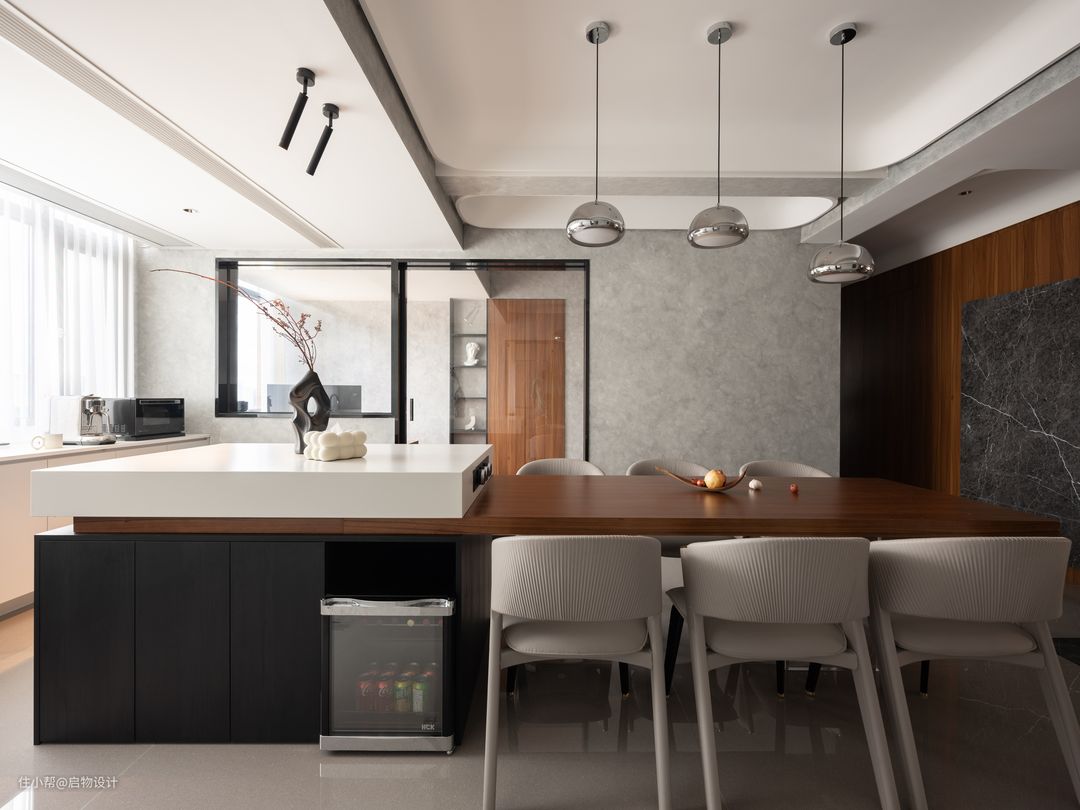 多功能书房留了1.8m的开间,除去书桌办公位,还留有1.2m的榻榻米床位,可做临时客卧或者未来改做儿童房,长条形空间另一侧则是储物和乐器摆放区。 餐厅由原本2.7m的开间变成3.6m,藉由生活阳台的并入也增加了6个平方,引入通透光源后,靠窗做半高轻食台也做西式烘焙区,餐岛台居中形成洄游动线空间。 由于原始结构梁位较多且又高又厚,最高的梁位将近50公分,离地仅2.4m,采用GRG装配式石膏吊顶,壳体结构弱化繁复的梁位最大化保留原始层高同时还能增加空间艺术效果。