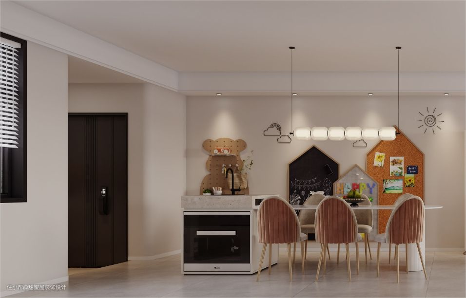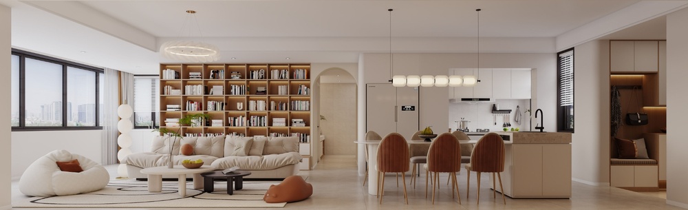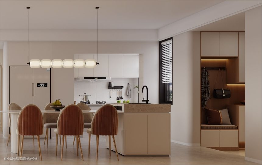 开阔通透的餐厨区域,在空间中心增加西厨岛台,丰富功能,减轻中厨区域负担。岛台+餐桌,更能丰富居住者之间的交流。