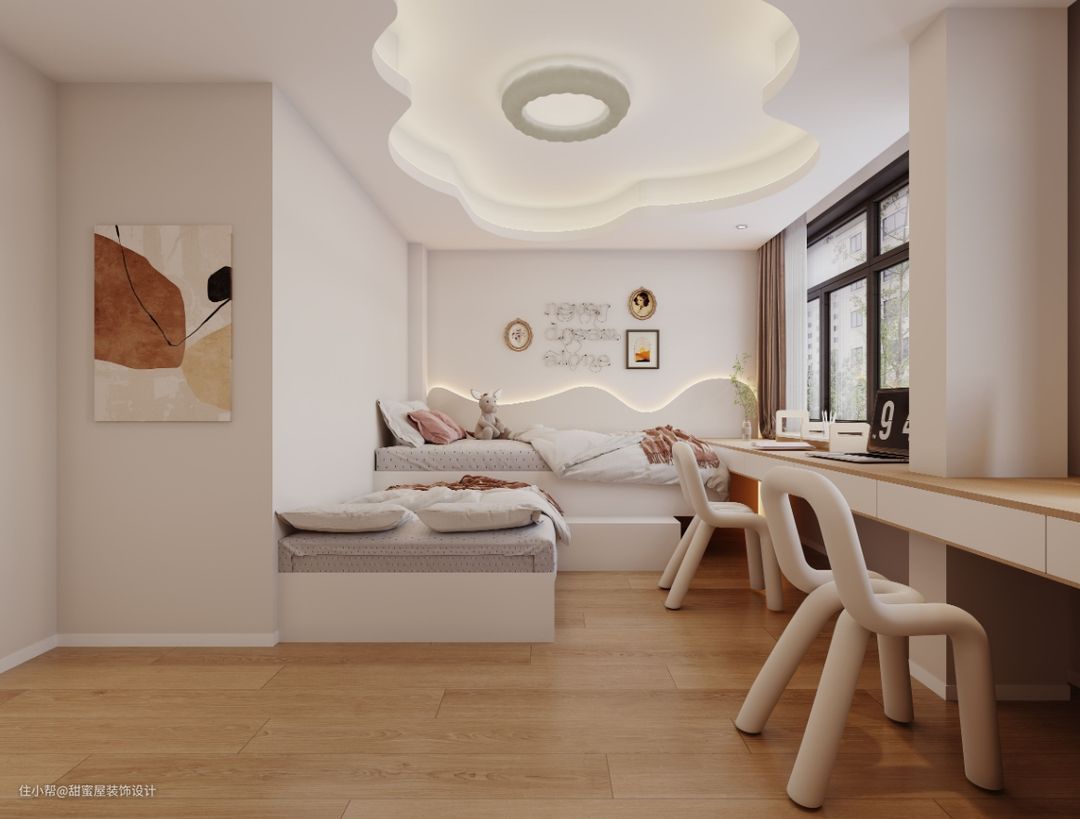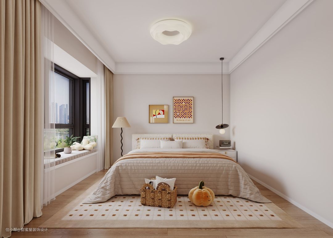 主卧的空间比较开阔,空间整体同样是奶油配色,加上柔和的软装,空间更加清新治愈。