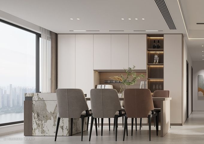 靠墙做一门到顶的收纳柜不仅美观还可以把空间得到最大化的利用,中间做成开放式收纳格可以摆放上绿植、相框等等装饰物来美化用餐环境,提升家居格调。