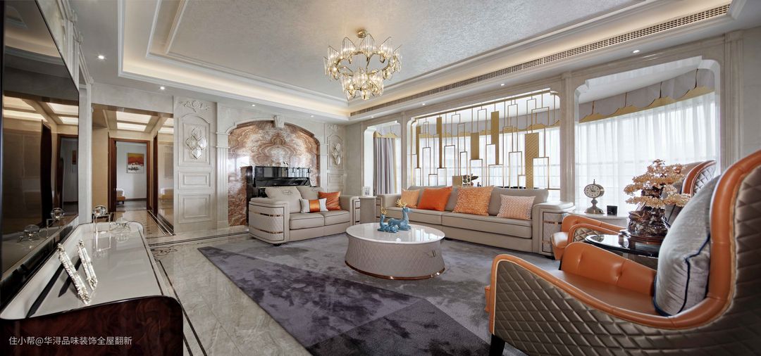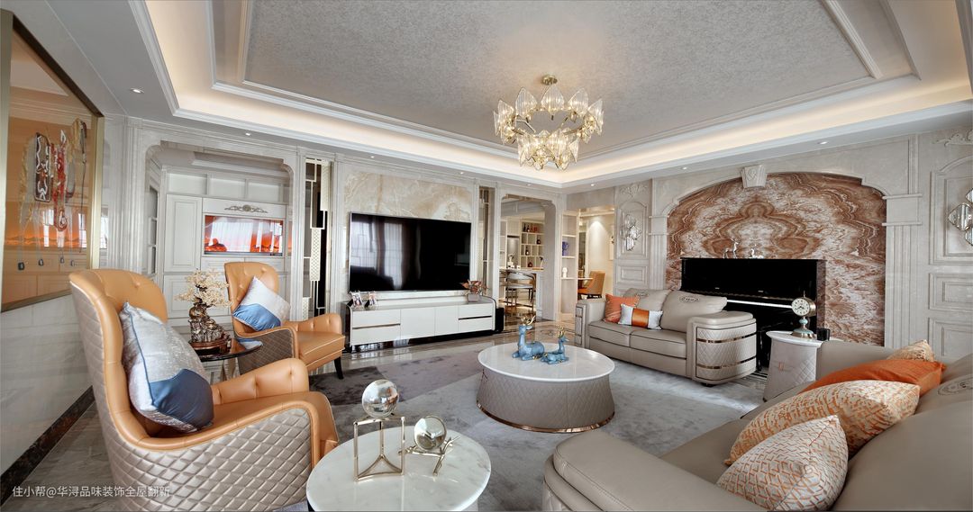 利用玄关墙作为电视背景墙,轴对称布局使得整个客厅更开阔大气,多层次的灯光效果增添了欧式的奢华感