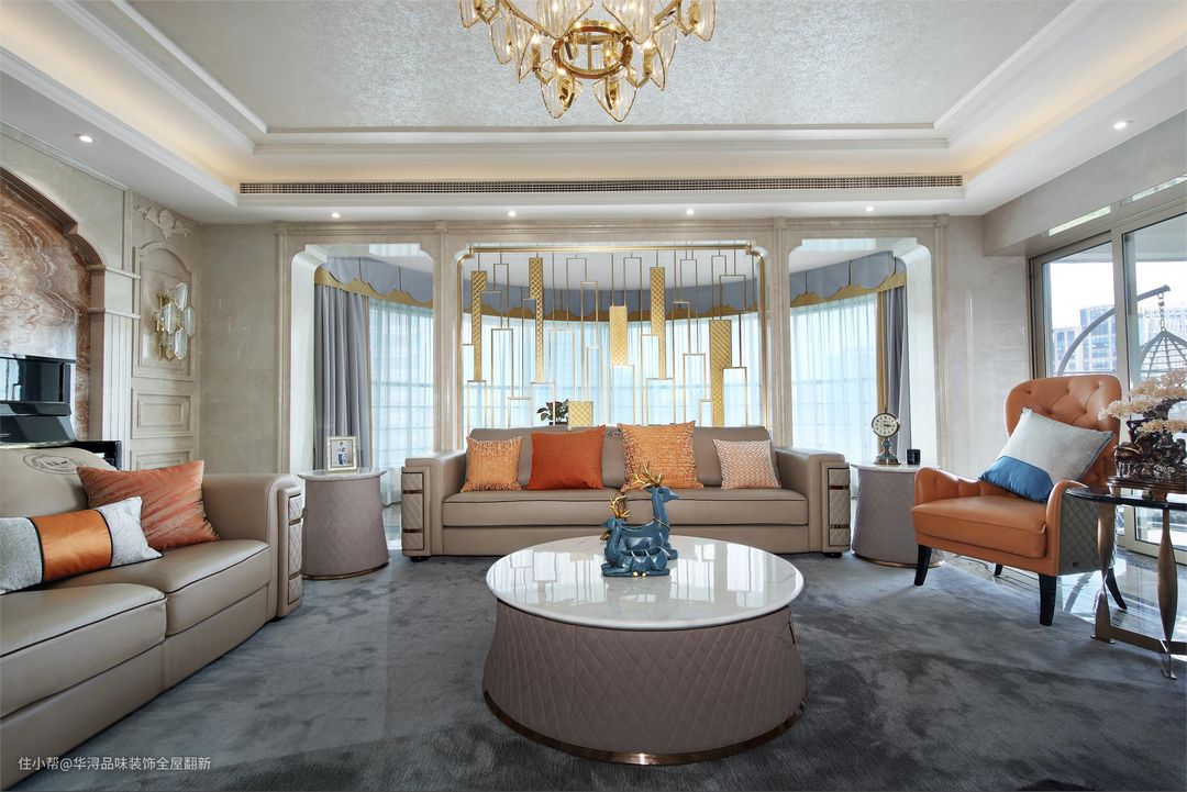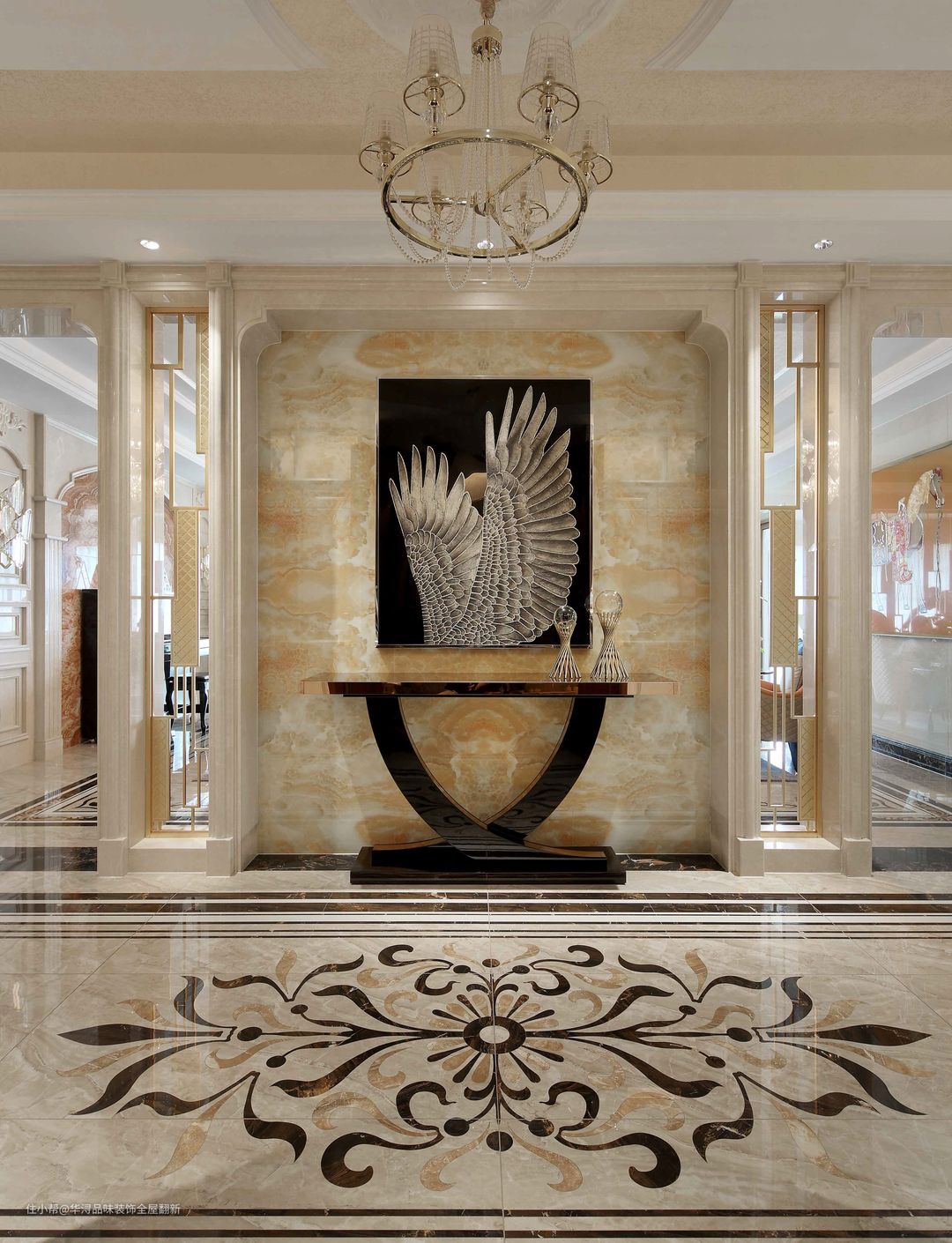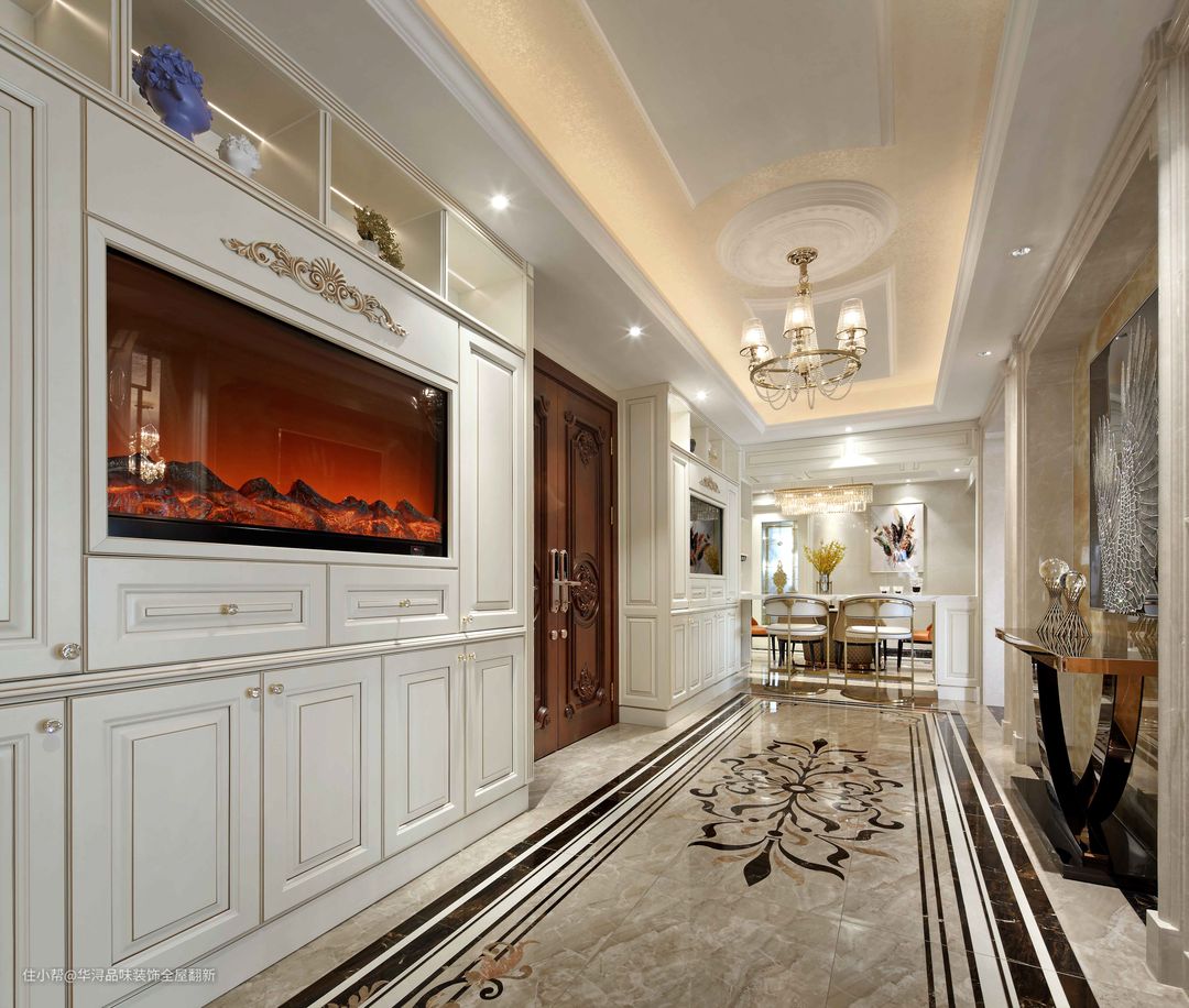 将原本餐厅区域改造为超大玄关,重新规划功能动线,沿着中轴线布局,让整体空间更规整大气。玄关两侧都可以进入到客厅,保护隐私的同时,也让回家有了一种尊贵的仪式感。 入户大门两侧设计玄关柜,释放收纳压力,白色的柜体、简约的线条凸显典雅与精致的格调。利用大理石拼花、精致灯饰、挂画等打造出高雅奢华的玄关空间,让人进门就眼前一亮。