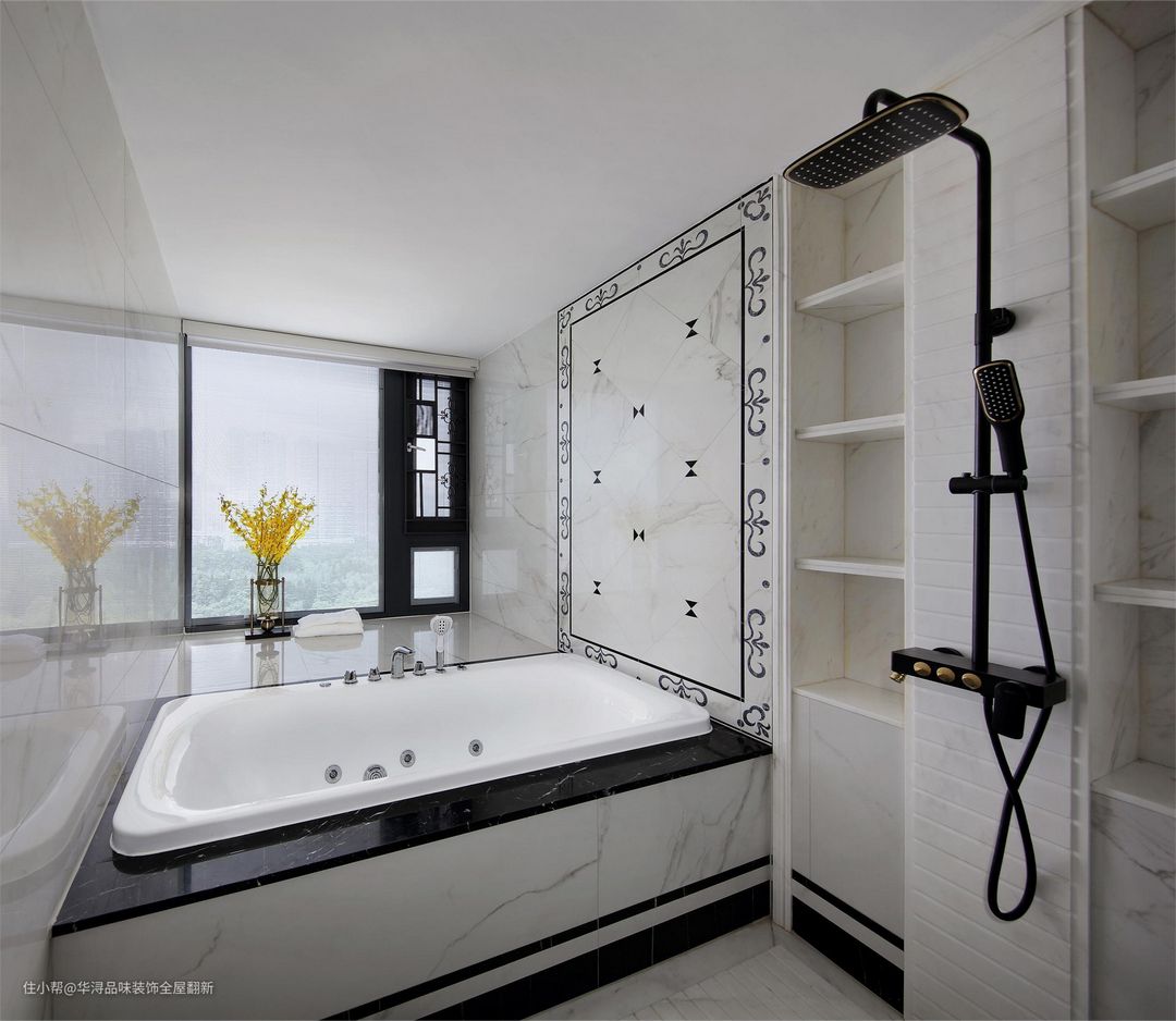 主卫采用浅色系设计,搭配黑色线条,赋予空间复古的韵味。城市凌厉的生活节奏,推着人不断前进,回到家之后,一个时尚高级的卫生间给予人们喘息的空间,放缓节奏提升幸福感。