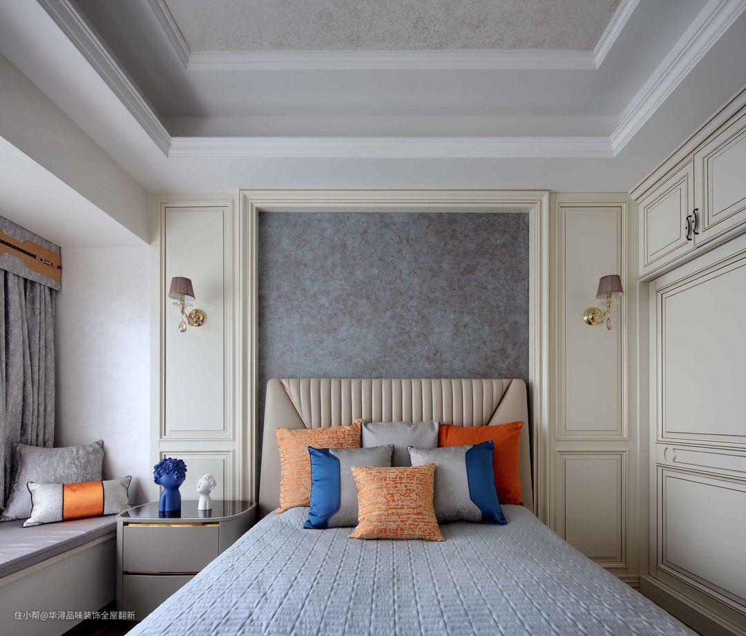 次卧设计简约而富有层次感,方框造型将欧式的典雅表现得淋漓尽致,壁灯渲染更温馨浪漫的家居氛围。