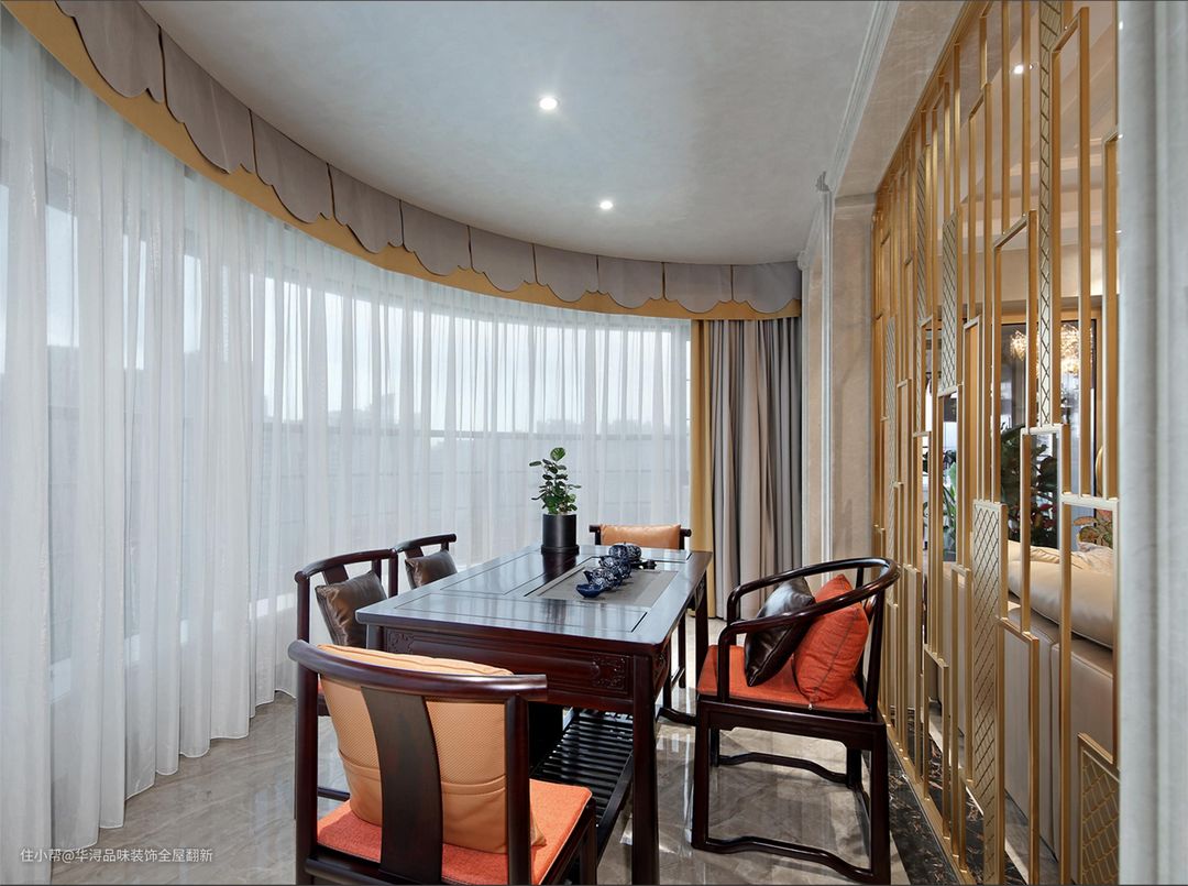 弧形大阳台正对着珠江公园,坐拥城市中央的蓬勃绿意,尽享生活的写意。设计师将这里开辟成一个品茶区,兼做一个小型会客厅,让男主人可以在这里品茶会客。 品茶区与客厅之间利用镂空隔断,形成隔而不断的朦胧美感,视线得以延伸,采光和通风也不会被影响。
