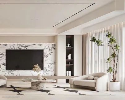 露台一半并入客厅,窗帘外置阳台处,嵌入收纳柜,集收纳和洗衣烘干于一体。再也不用担心衣服在梅雨季节干不了。 浅灰色和奶白色知性优雅的人文气息融合造型独特的植物,营造出精致高级且温馨氛围感! 无主灯设计烘托内敛格调,大量简洁的直线条搭配细腻的弧形元素,阳角使用弧形既避免了碰头的危险,在视觉上也更显温柔。 大理石和开放格结合打造的电视背景墙,既能提升视觉享受又能满足收纳需求,在不经意间凸显生活品质。