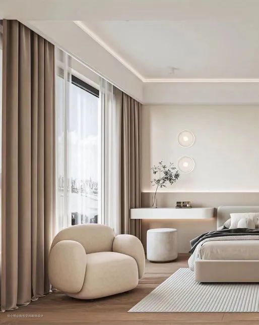 空间整体采用奶茶色调,突出简约温馨氛围感。奶白色背景搭配灰色木饰面板内嵌线形灯质感满满。同色系的床品、轻奢感的设计搭配现代感的地毯,丰富空间层次感。 去床头柜设计减少卧室的死板,简约两用的梳妆台设计和轻盈的亚克力壁灯增强实用性。简约但不简单,轻简于形奢繁于心,强调品质注重细节,谁不想拥有一个低调又有品位的家呢?