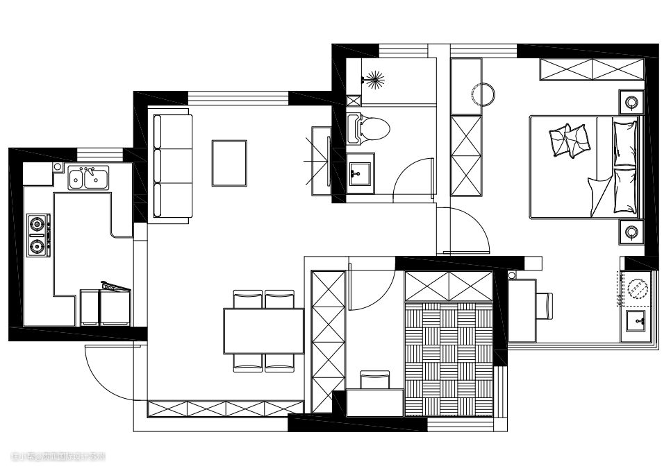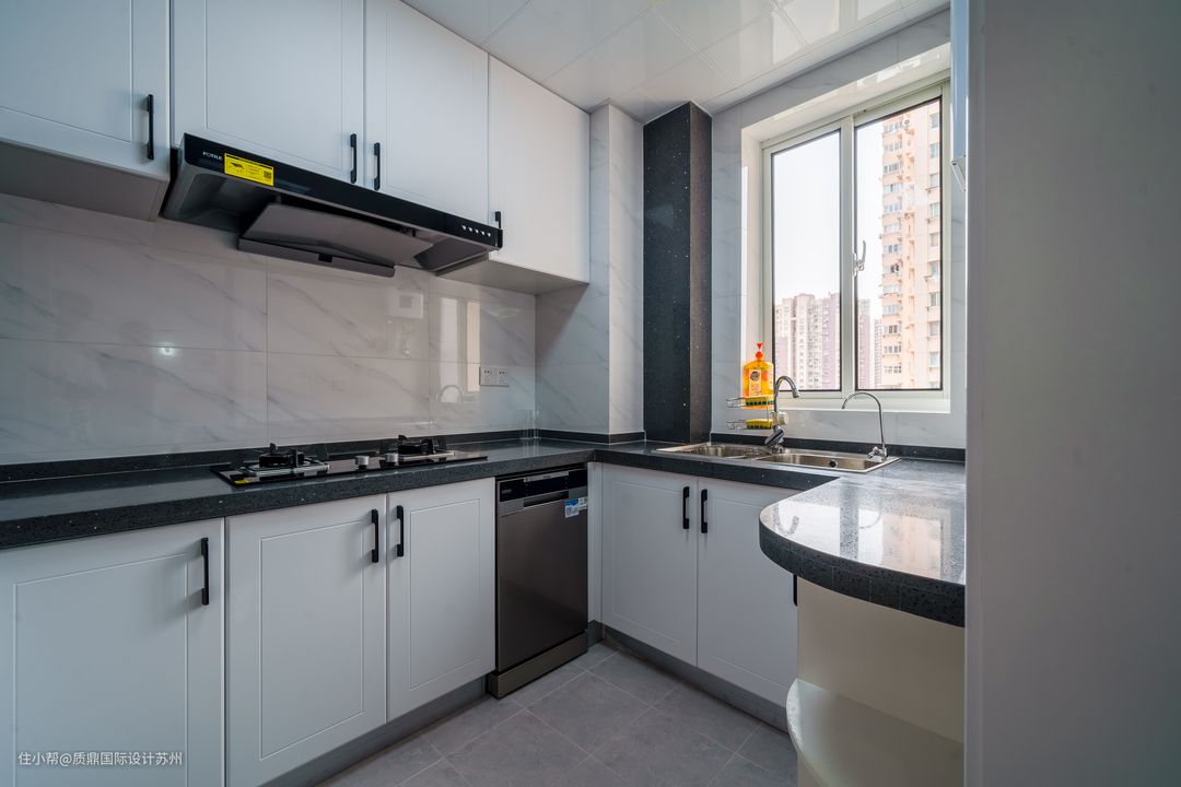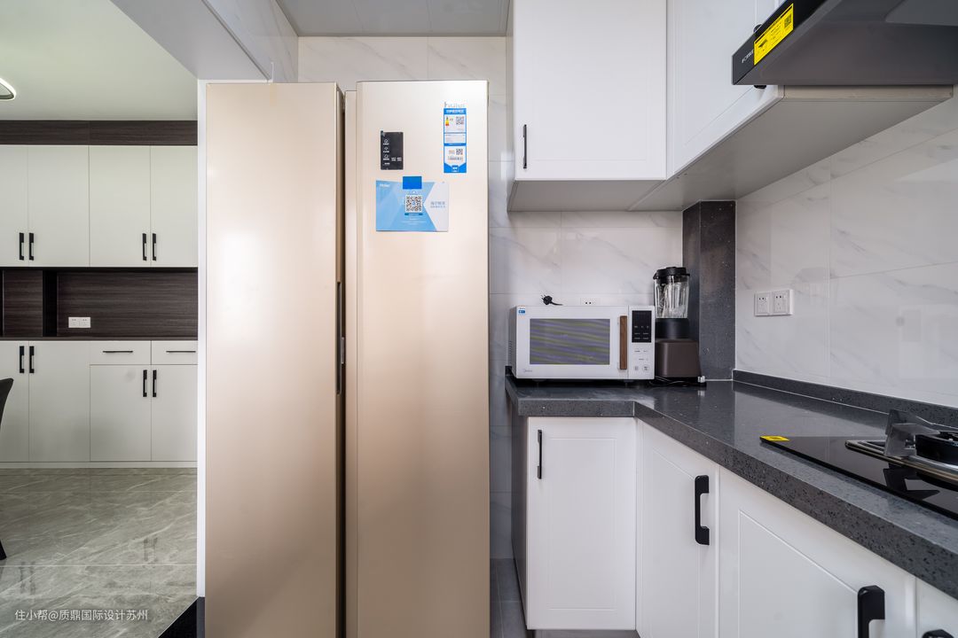 开放式厨设计让增强了两人人平时零碎用餐互动时光,赋予了共同的生活乐趣。厨房设计u字形台面,充分利用厨房收纳空间,厨房右手边设计成转角台面,方便利用,避免尖角。