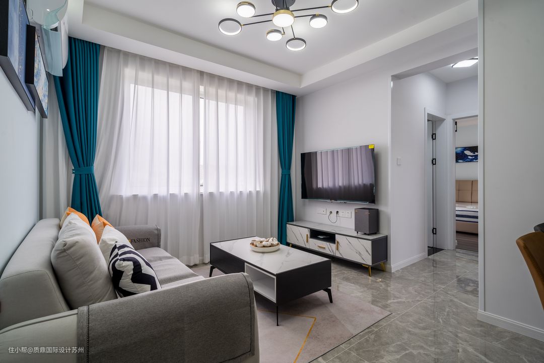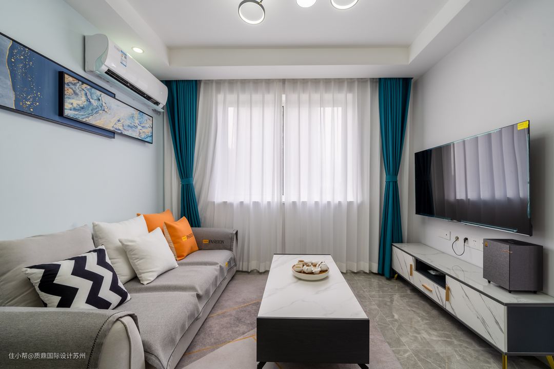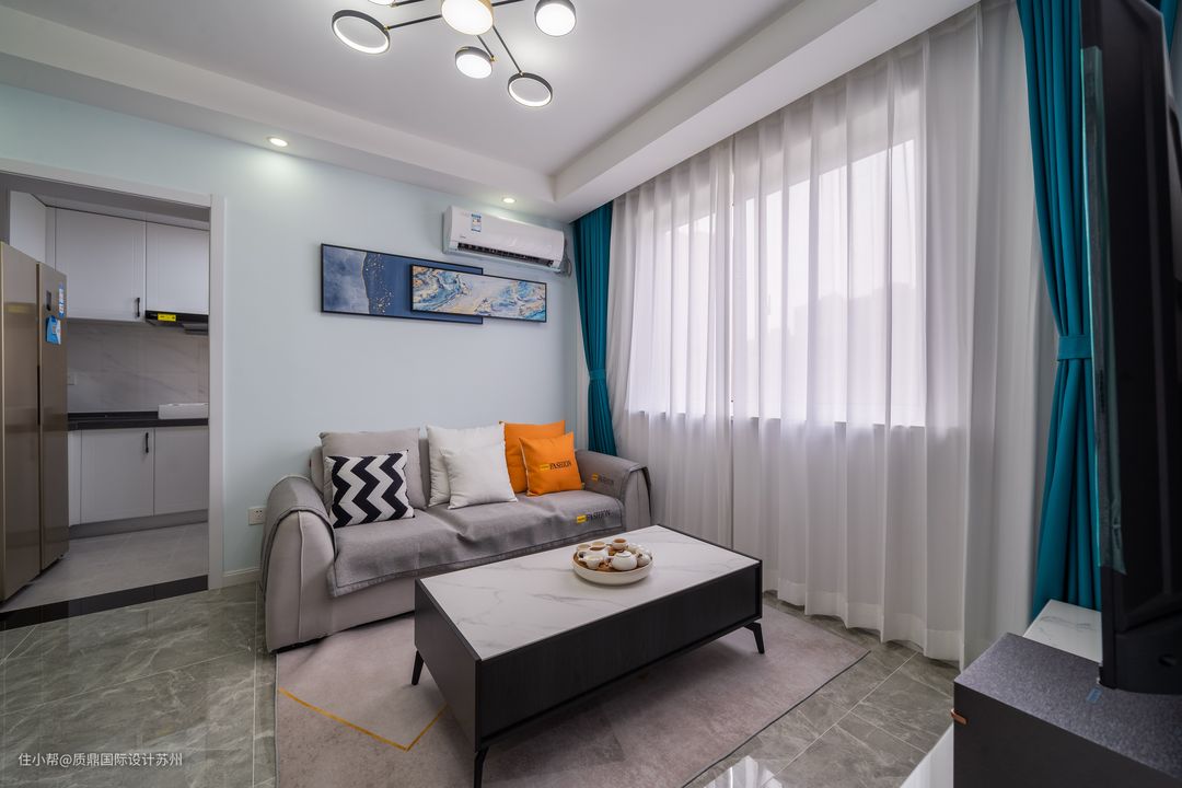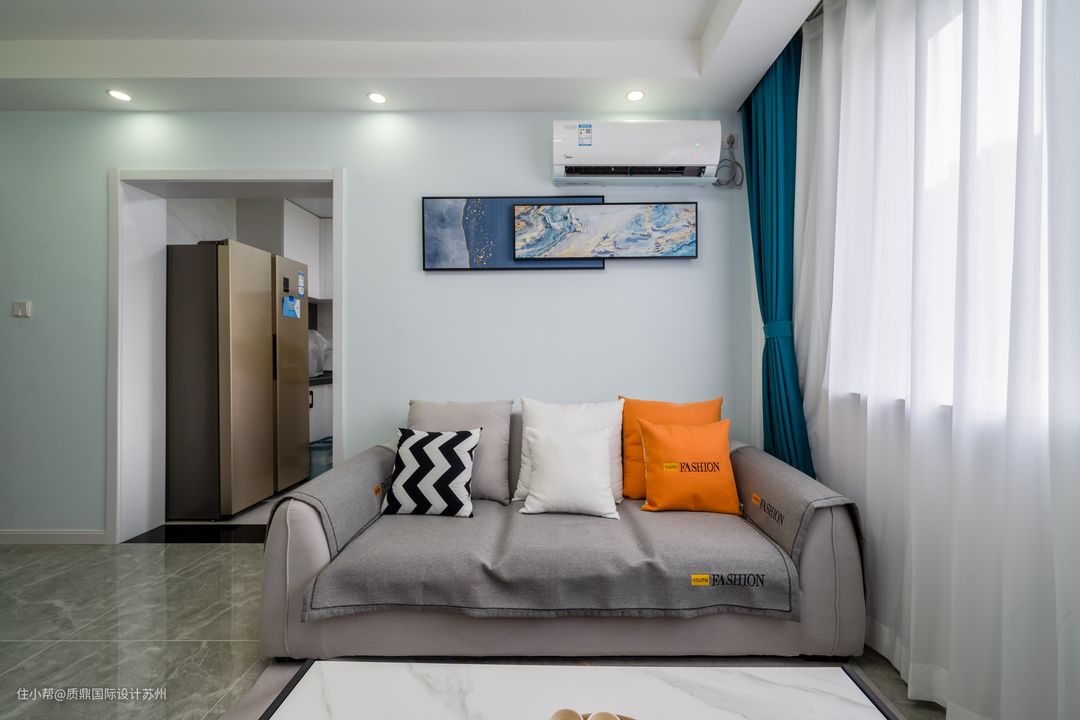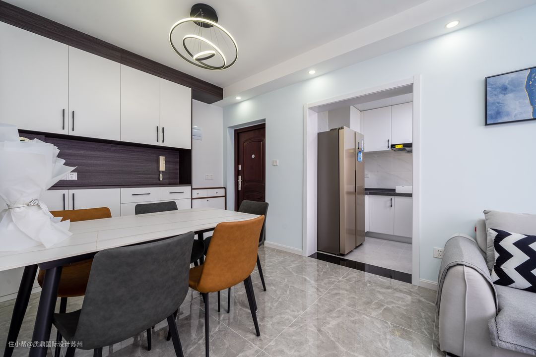 客餐厅但灰色系与不同纯度蓝色系的碰撞,是整体空间感更加有层次感,搭配地面釉面的大理石瓷砖,简约的同时更加雅致。再通过橙色系的点缀,空间感增加一丝活跃感