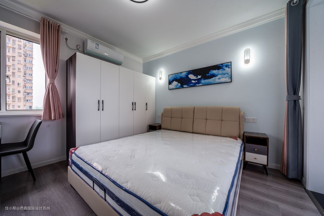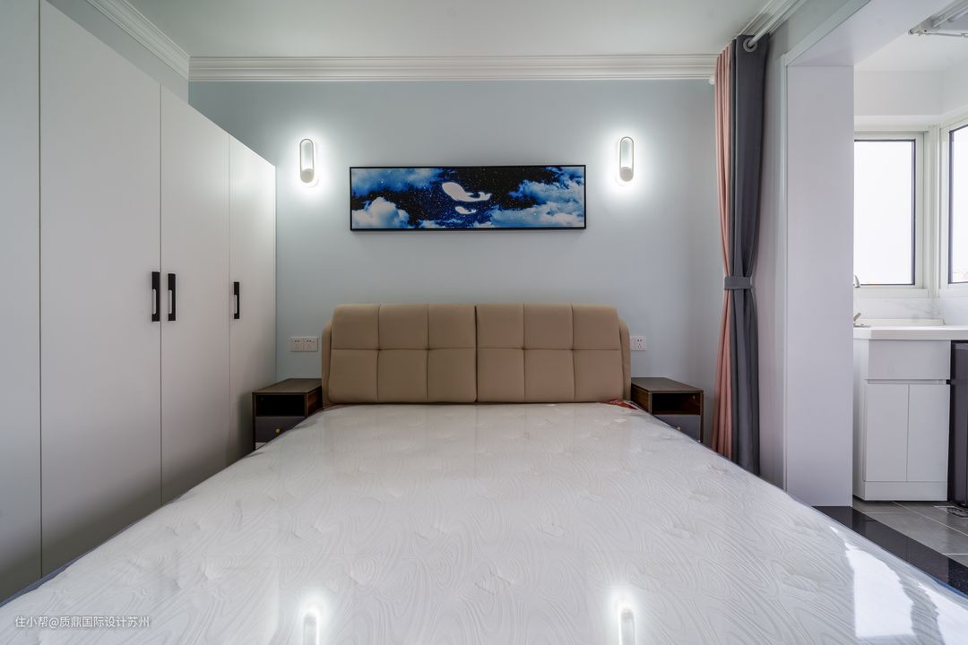主卧延续客餐厅的配色,化妆台衣柜一体柜,在满足过道空间的同时床的另外一侧也做了收纳衣柜,大大增加了收纳空间。 极简的室内装饰稍加点缀,整个惬意的空间被屋主喜爱的自然香氛所包围,高效舒适的睡眠随之而来。柔滑白的烤漆门板与稳重的胡桃木色结合,成熟典雅,搭配上女主人喜欢的粉色有添加了一丝丝柔和。