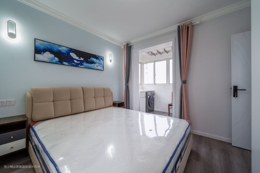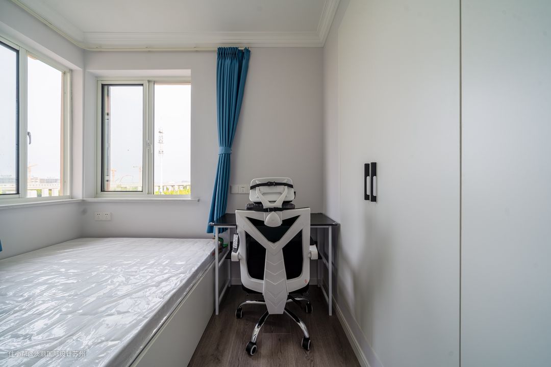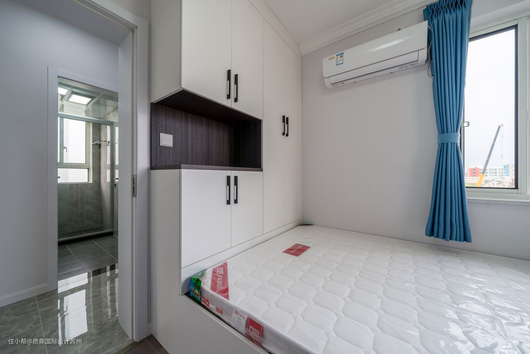次卧收纳为主,在房间的右边设计了嵌入式的衣帽柜。次卧室左边设计了榻榻米书柜一体式,前期做为书房,后期为小孩的收纳奠定基础。