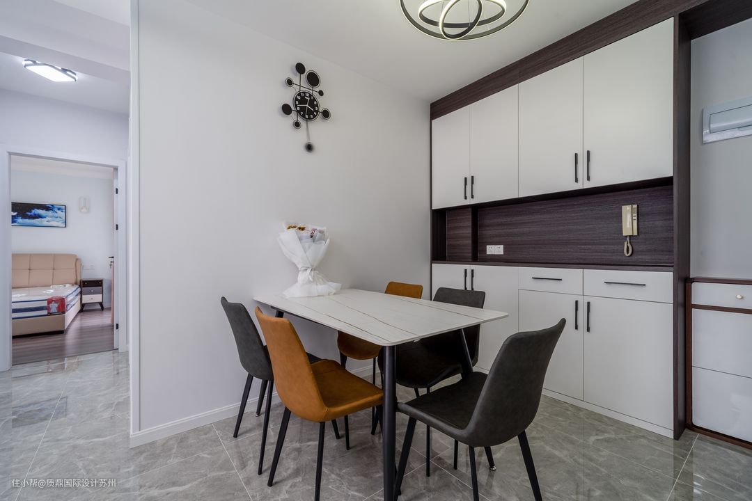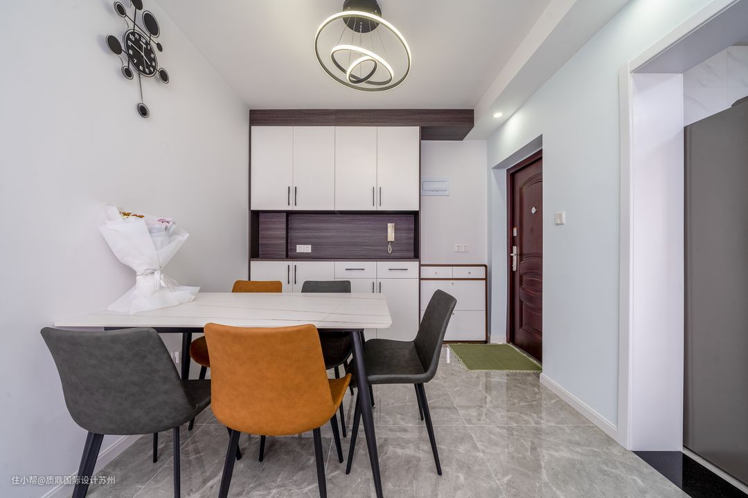 灰色空间往往会让屋主觉得家里过于冷淡,所以在软装阶段橘色沙皮材质作为主体搭配,跳跃的颜色,让别致的设计感更具舒适性,与沙发的橙色抱枕呼应。灰色大理石瓷砖搭配上白色岩板材料的餐桌台面,觥筹交错,增加了基调的质感。餐边柜和入户鞋柜一体设计,充分利用空间的收纳,鞋柜设计的客户喜欢的胡桃米色,色调与防盗门、灰色餐椅、灰色桌角色调一致。
